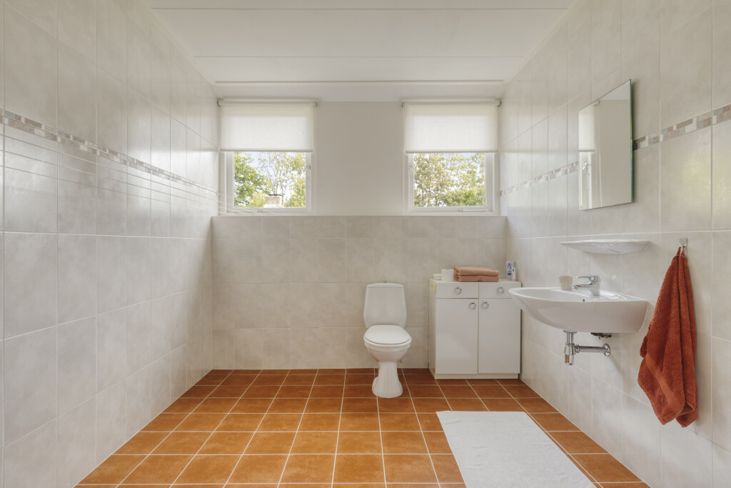 De slaapkamer op de begane grond is voorzien van een eigen badkamer (ook via de hal toegankelijk) en beschikt over een ligbad, douche en wastafel.
