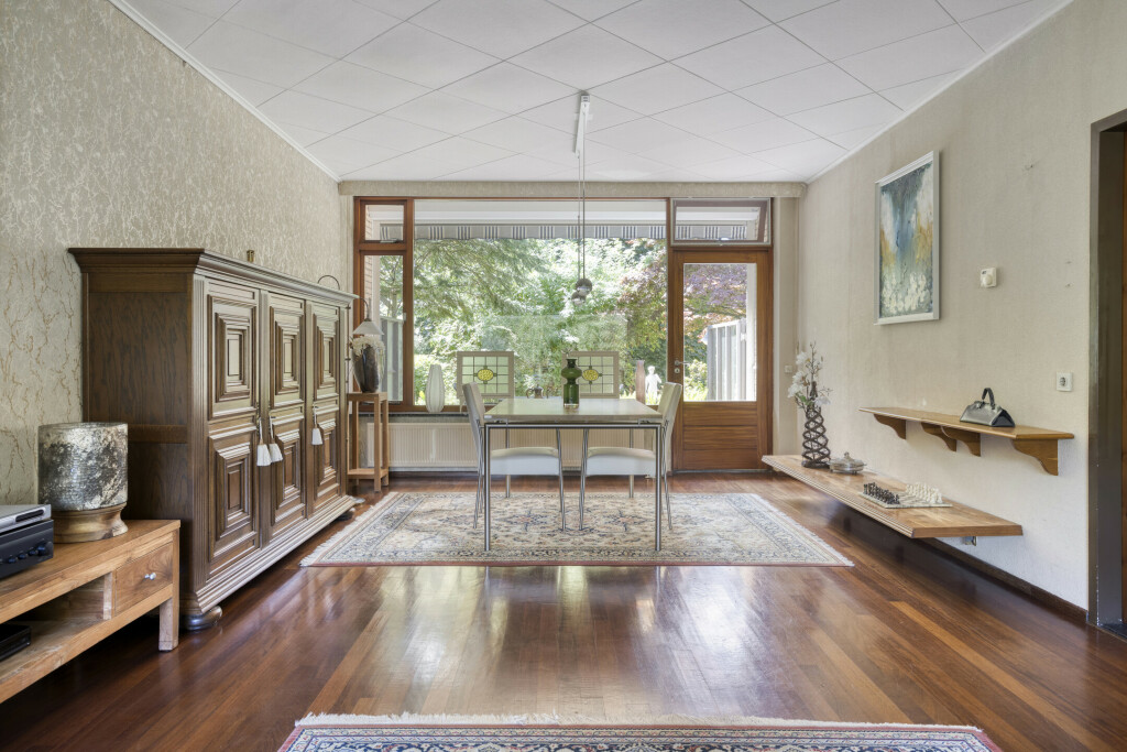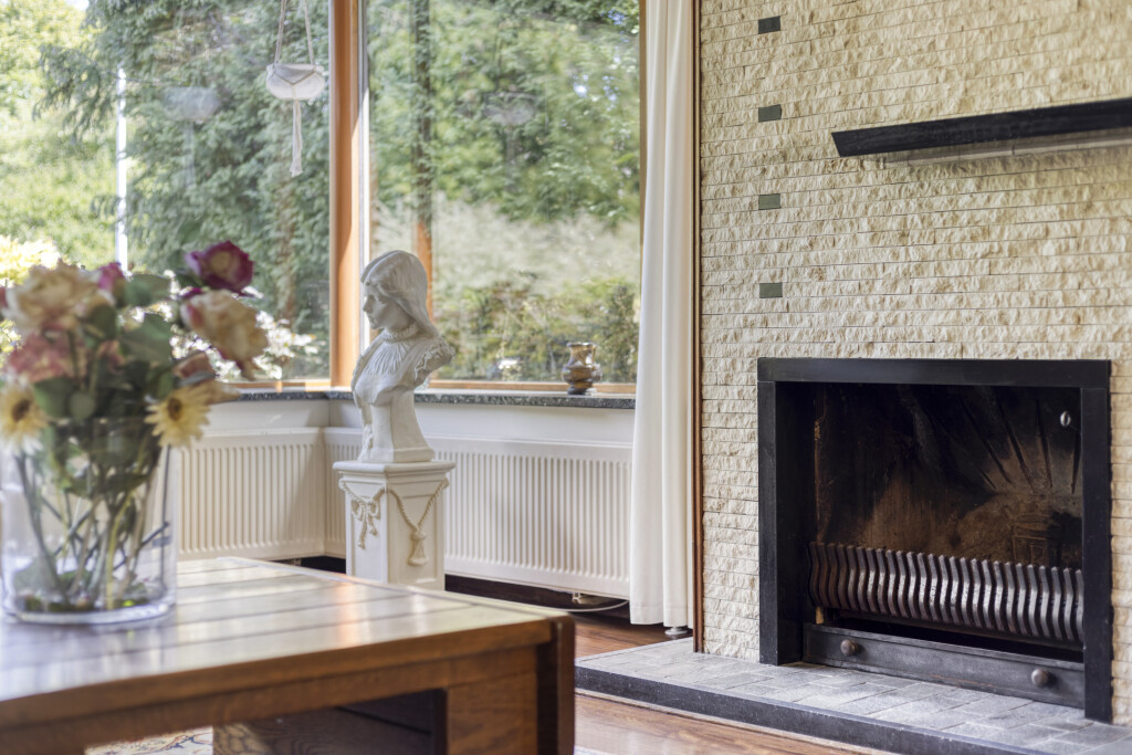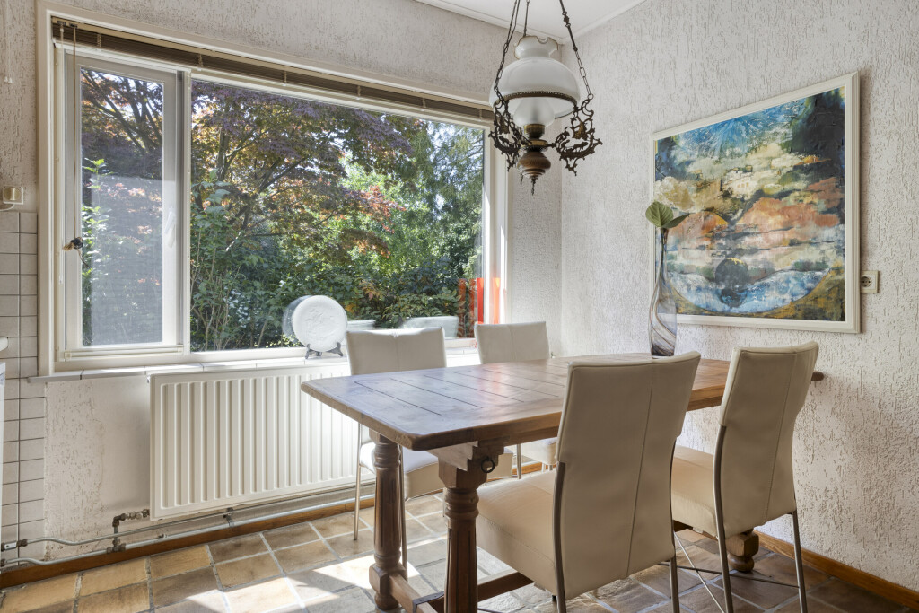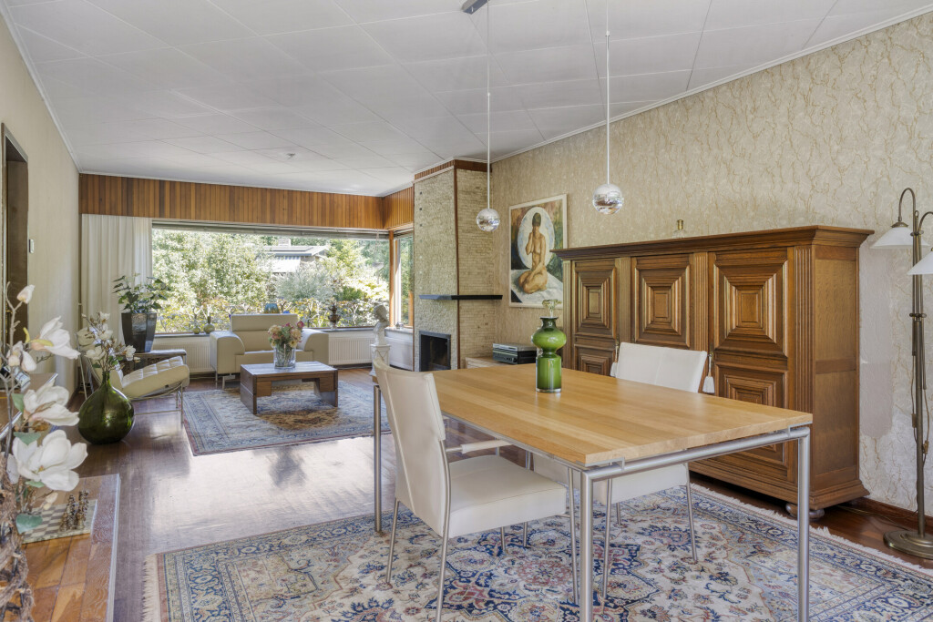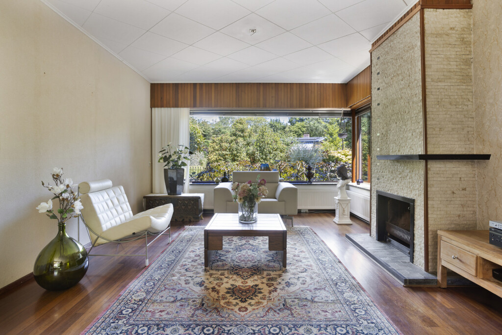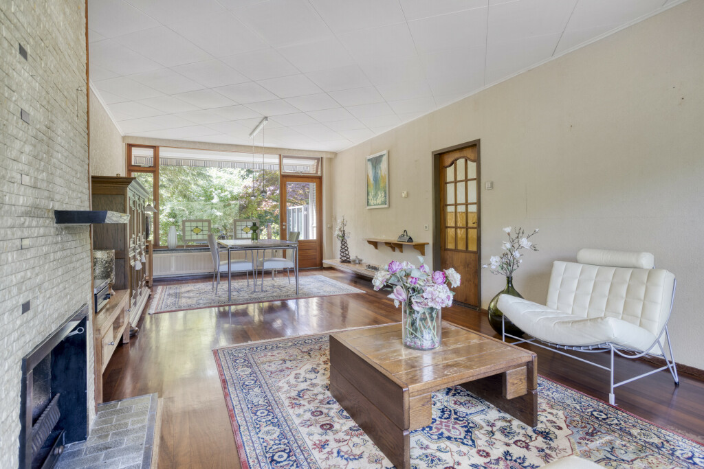 Via de riante hal heeft u toegang tot de woonkamer. De lichte doorzonwoonkamer is sfeervol en ruim, met grote raampartijen en een gezellige haard. Het enorme hoekraam zorgt voor maximaal lichtinval vanuit verschillende richtingen en zorgt tevens voor een prachtige verbinding met buiten. Hier is het heerlijk ontspannen met uitzicht op het groen rondom de woning.