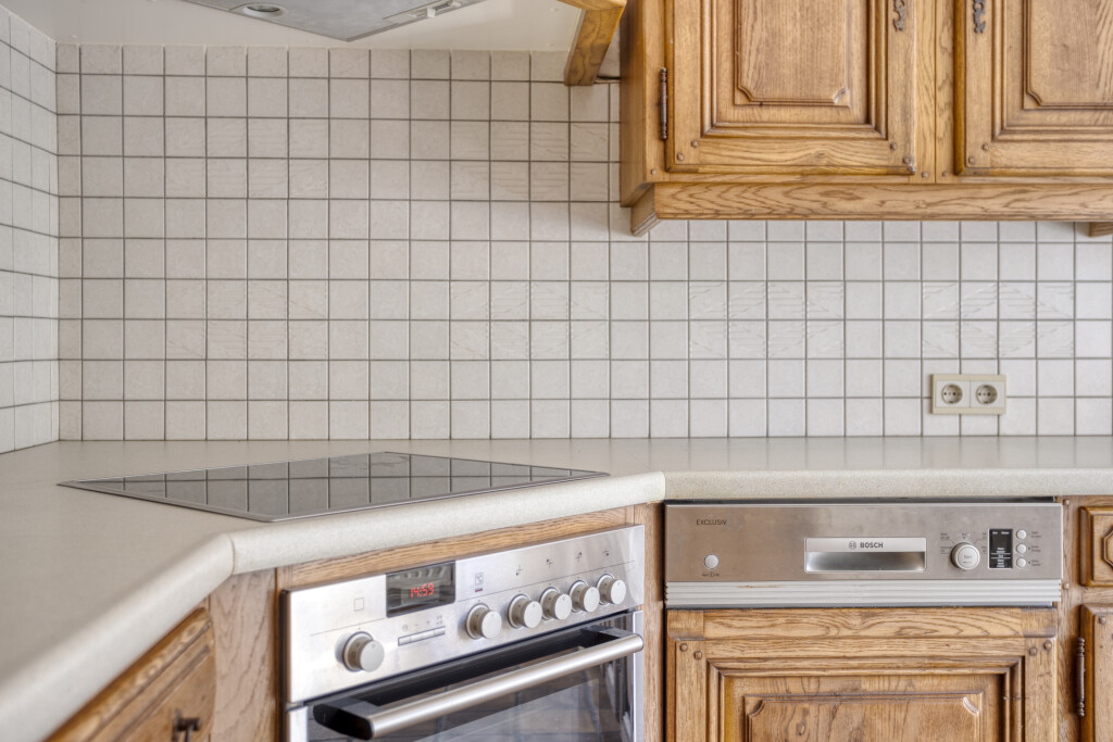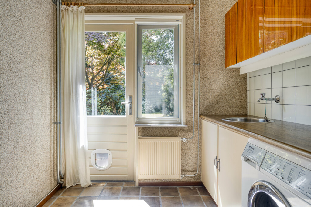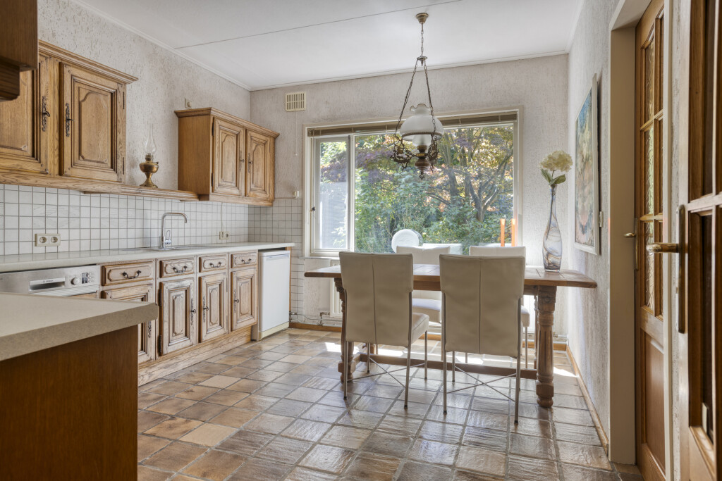 De royale woonkeuken met prachtig zicht op de tuin is geplaatst in een praktische hoekopstelling en biedt volop ruimte om te koken en te tafelen. De keuken is voorzien van diverse inbouwapparatuur, waaronder een keramische kookplaat, oven, afzuigkap, vaatwasser en een dubbele spoelbak. Aansluitend bevindt zich de bijkeuken, waar je extra bergruimte vindt, een tweede keukenblok met spoelbak en de aansluitingen voor witgoed. Vanuit de bijkeuken loop je zo de heerlijke tuin in.