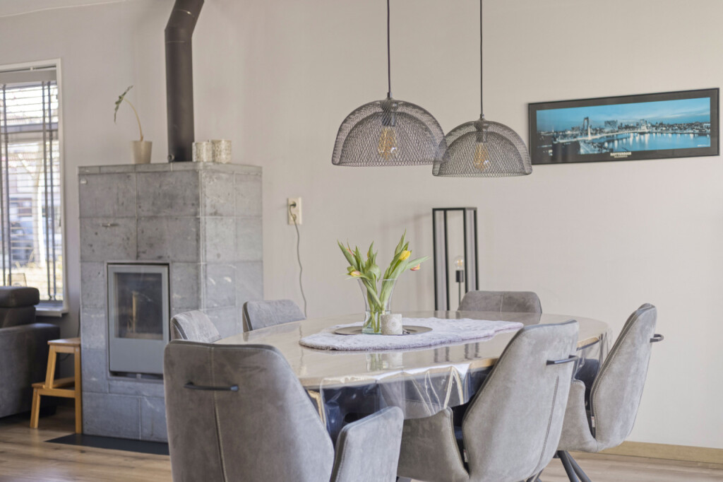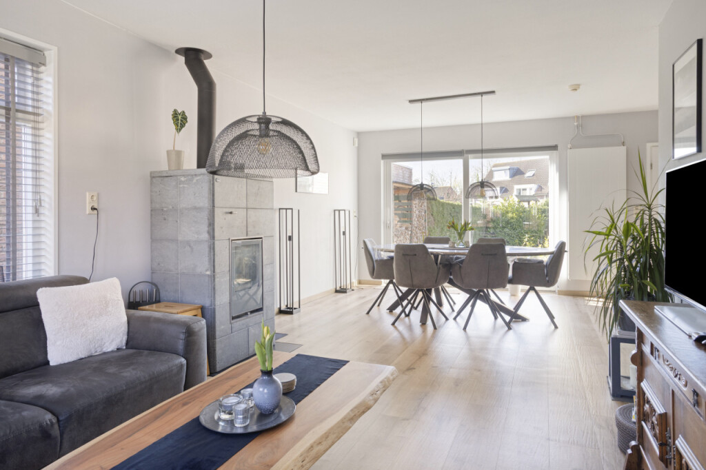 Via de entree komt u in de hal met toiletruimte en trapopgang naar de eerste verdieping. De ruime woonkamer is heerlijk licht dankzij de grote schuifpui naar de tuin, waardoor binnen en buiten op natuurlijke wijze in elkaar overlopen. De open haard vormt een sfeervol middelpunt en zorgt voor extra warmte en gezelligheid tijdens de koudere dagen.