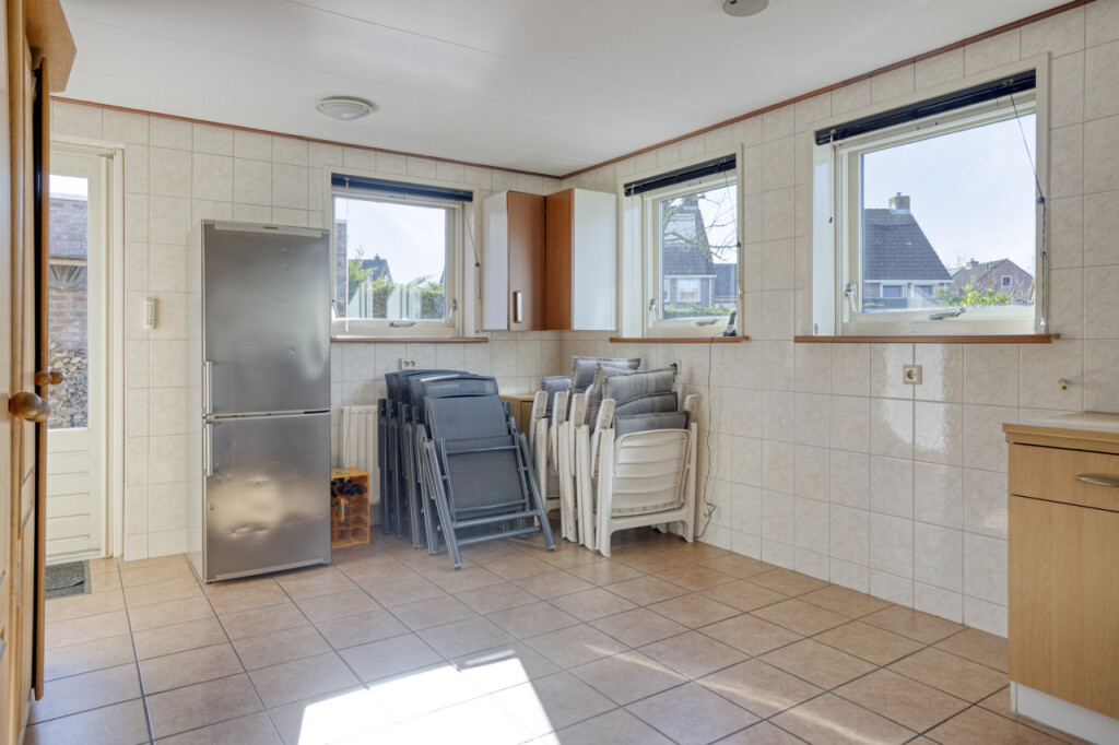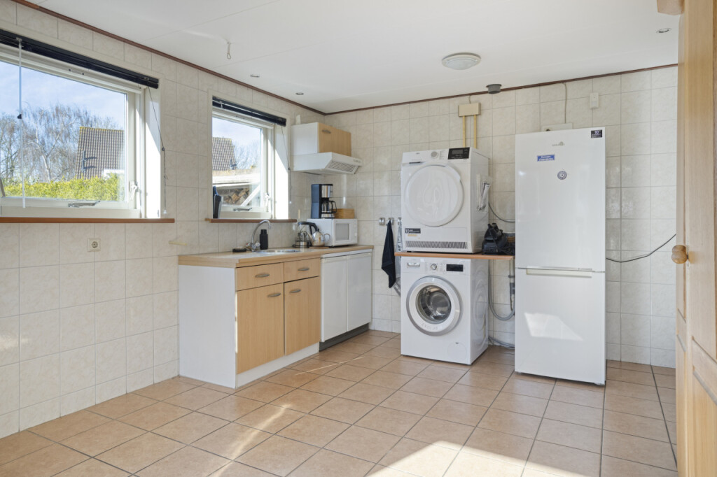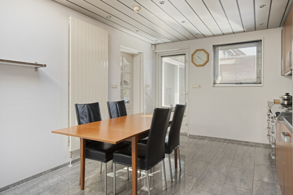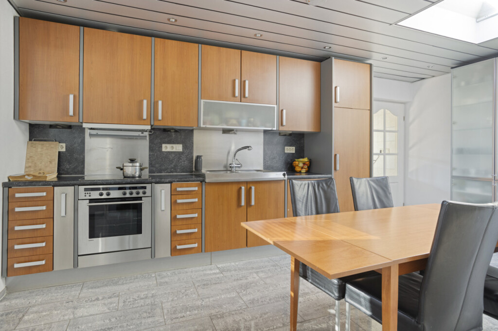 De moderne keuken is praktisch ingericht en voorzien van diverse inbouwapparatuur. Dankzij de royale opzet is er voldoende ruimte voor het plaatsen van een eettafel, waardoor u hier kunt spreken van een volwaardige eetkeuken â een fijne plek om samen te komen.