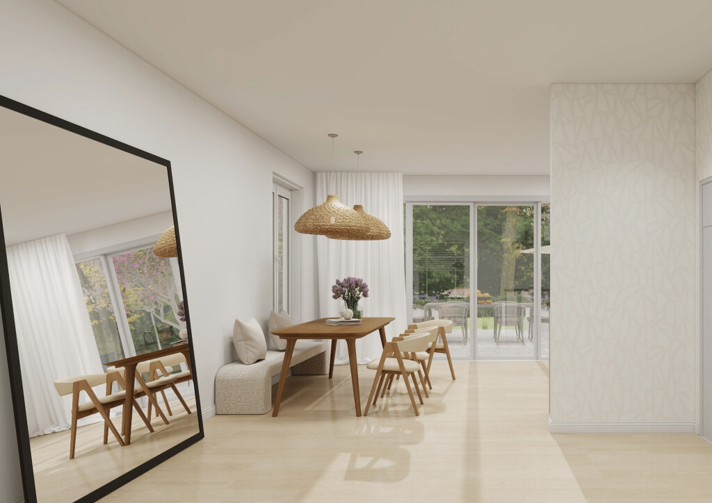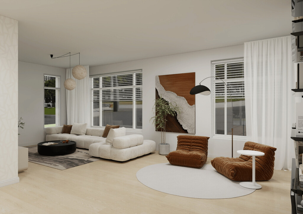 Je komt binnen in een ruime hal met garderobe, meterkast en modern afgewerkt toilet. Vanuit hier stap je de lichte, open woonkamer in. Dankzij grote raampartijen en een prettige indeling is dit een heerlijke leefruimte waar je je meteen thuis voelt.