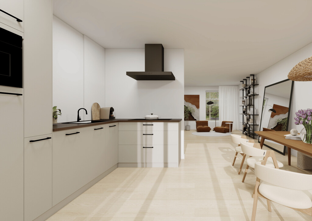 De open keuken aan de achterzijde van de woning is voorzien van de aansluiting voor de luxe keuken, welke zit inbegrepen in de koopsom.