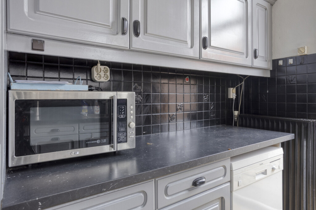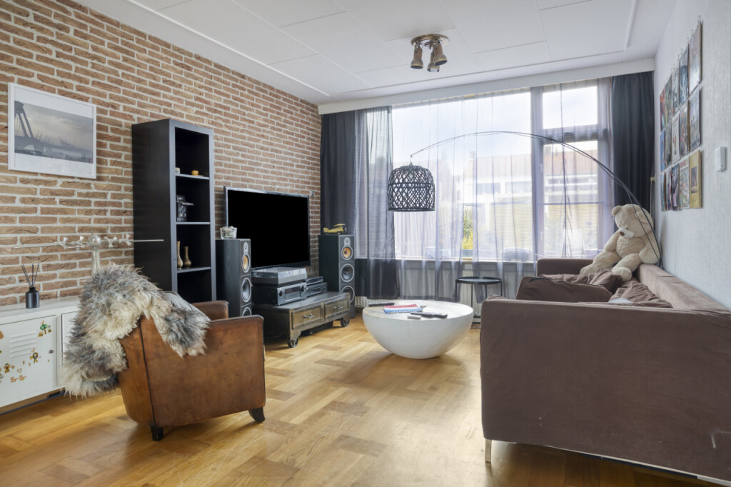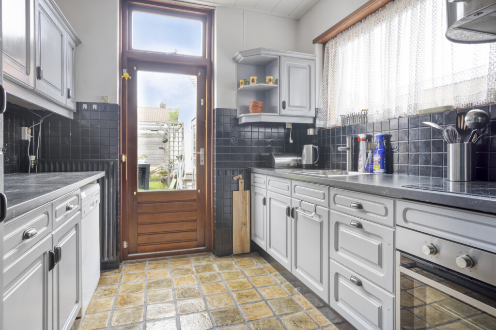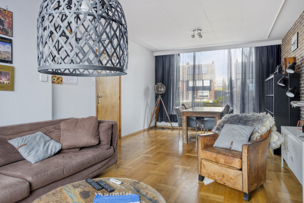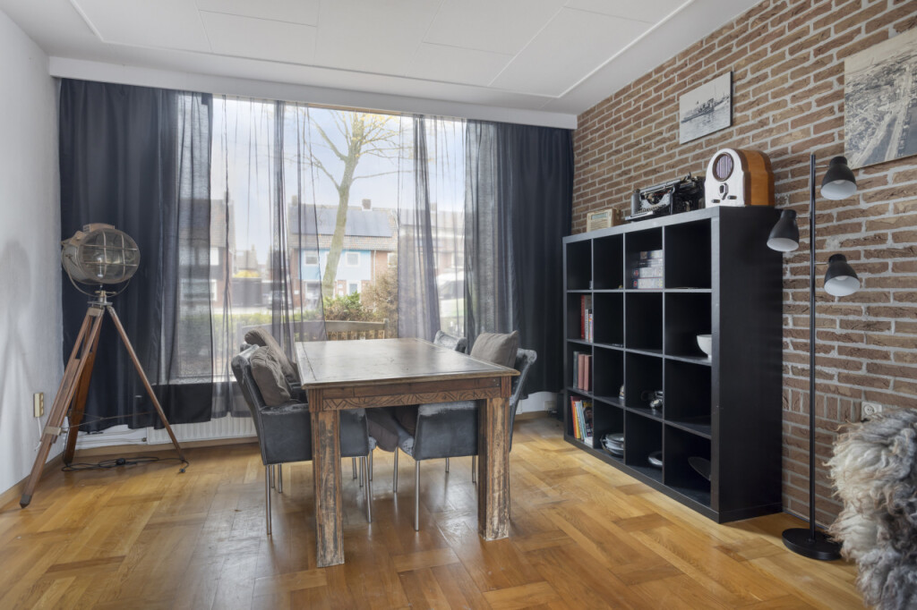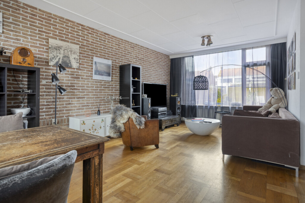 Je komt de woning binnen aan de zijkant, in een hal met de trapopgang, een vaste berging en een toilet met fonteintje. Vanuit hier loop je door naar de lichte doorzonwoonkamer met een sfeervolle bakstenen muur of naar de praktische keuken aan de achterzijde. De keuken is voorzien van inbouwapparatuur en werkbladen aan weerszijden en heeft een deur die direct toegang geeft tot de achtertuin.