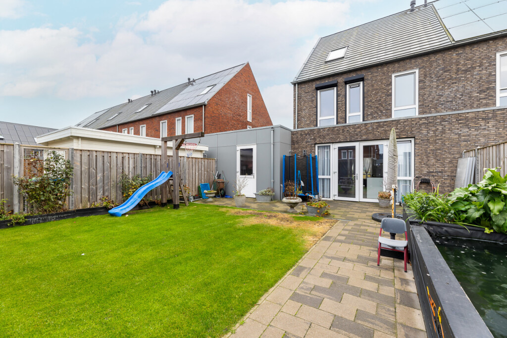 De achtertuin sluit mooi aan bij de sfeer van het huis: overzichtelijk, praktisch en uitnodigend. Het terras biedt plek voor een eettafel of loungeset, het gazon geeft ruimte en rust, en de borders zorgen voor kleur en seizoenservaring. De tuinkamer voegt een fijne extra plek toe waar je al vroeg in het jaar buiten kunt zitten. De vrije achterom maakt de tuin gemakkelijk bereikbaar, en de houten berging, aangebouwd aan de tuinkamer, biedt volop opbergruimte. De tuin ligt op het noorden, maar dankzij de open ligging is er overdag een prettige afwisseling tussen zon en schaduw.