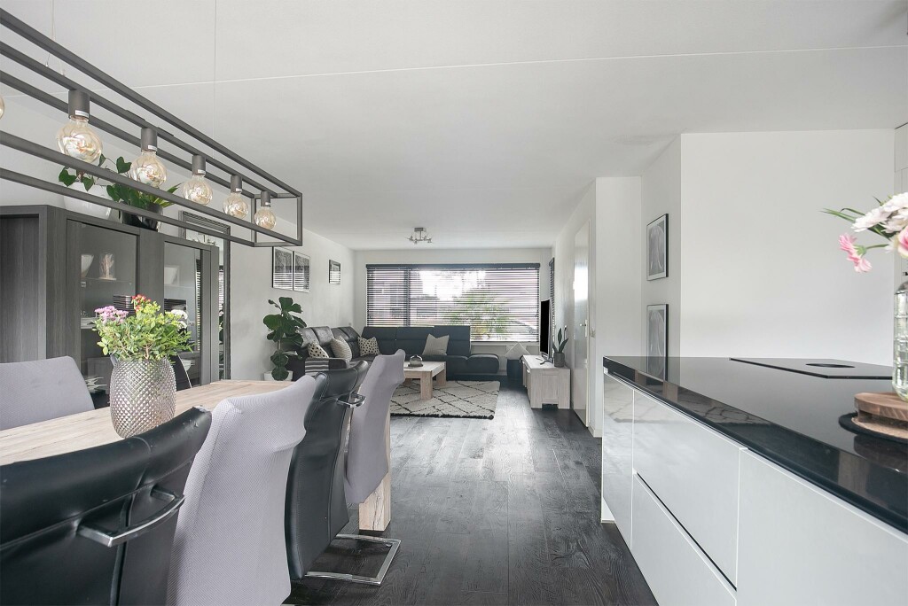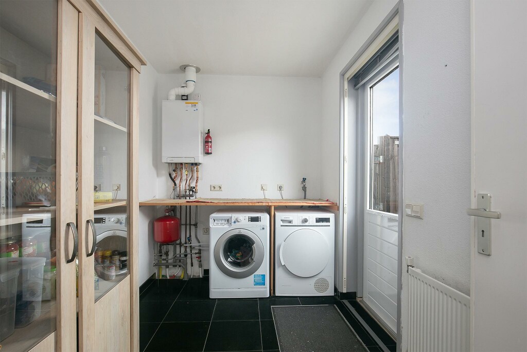 Enter the house through the covered entrance. From the hall, with a meter cupboard and toilet with a small sink, you step into the spacious and bright living room with sliding doors to the backyard. The modern, open kitchen is a real eye-catcher! The high-gloss kitchen is equipped with all imaginable appliances, such as a sink and cooking island with an integrated extractor hood and Quooker, oven, microwave, dishwasher, and built-in coffee machine. In the practical utility room, you will find connections for laundry appliances.