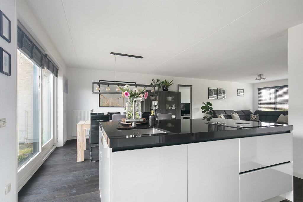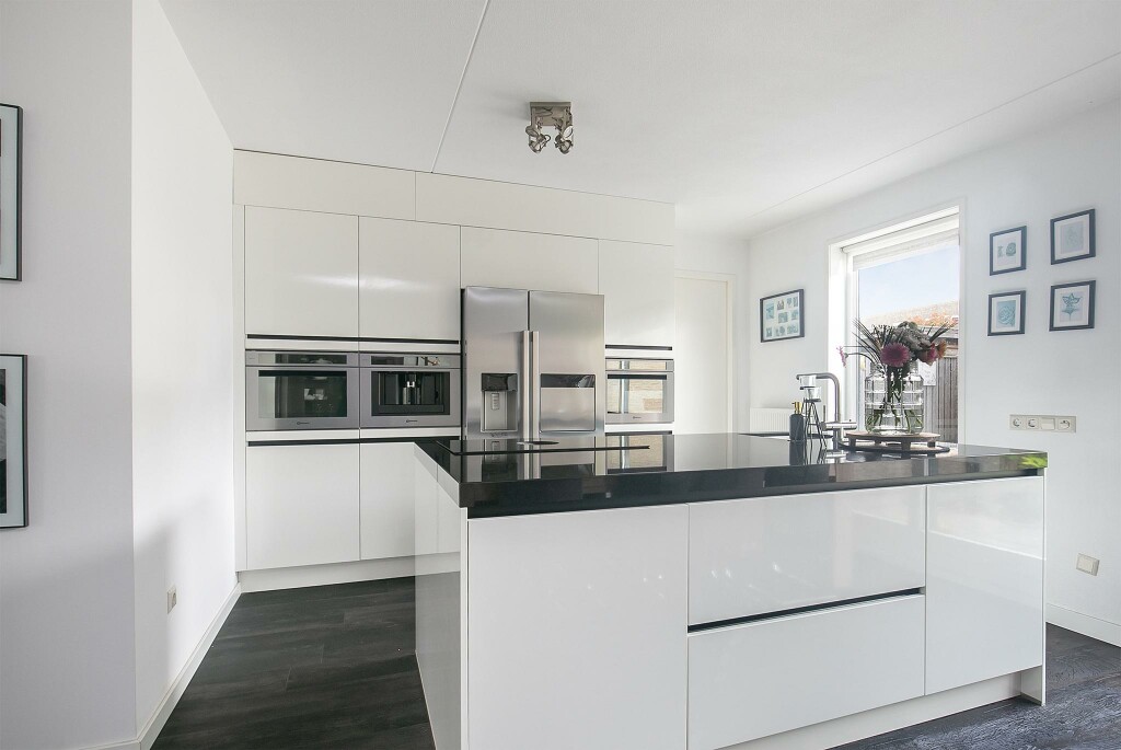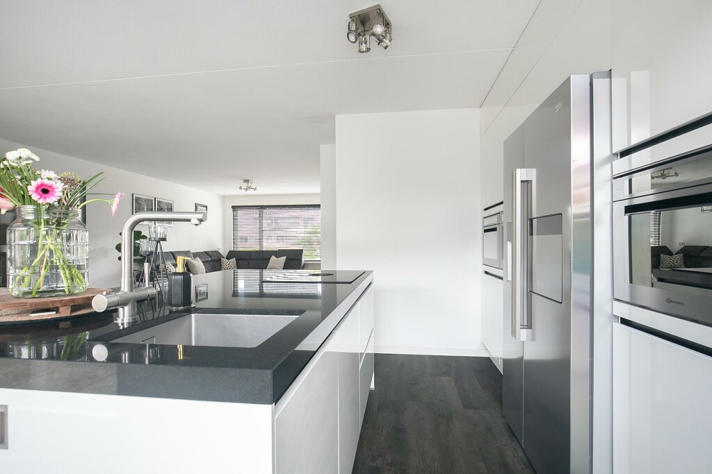 Je komt de woning binnen via de overdekte entree. Vanuit de hal met meterkast en toilet met fonteintje betreed je de royale en lichte woonkamer met schuifpui naar de achtertuin. De moderne, open keuken is een echte eyecatcher in deze woning! De hoogglans keuken is ingericht met alle denkbare apparatuur, zoals een spoel- en kookeiland met geïntegreerde afzuigkap en Quooker, oven, magnetron, vaatwasser en ingebouwd koffieapparaat. In de praktische bijkeuken tref je de aansluitingen voor witgoedapparatuur.