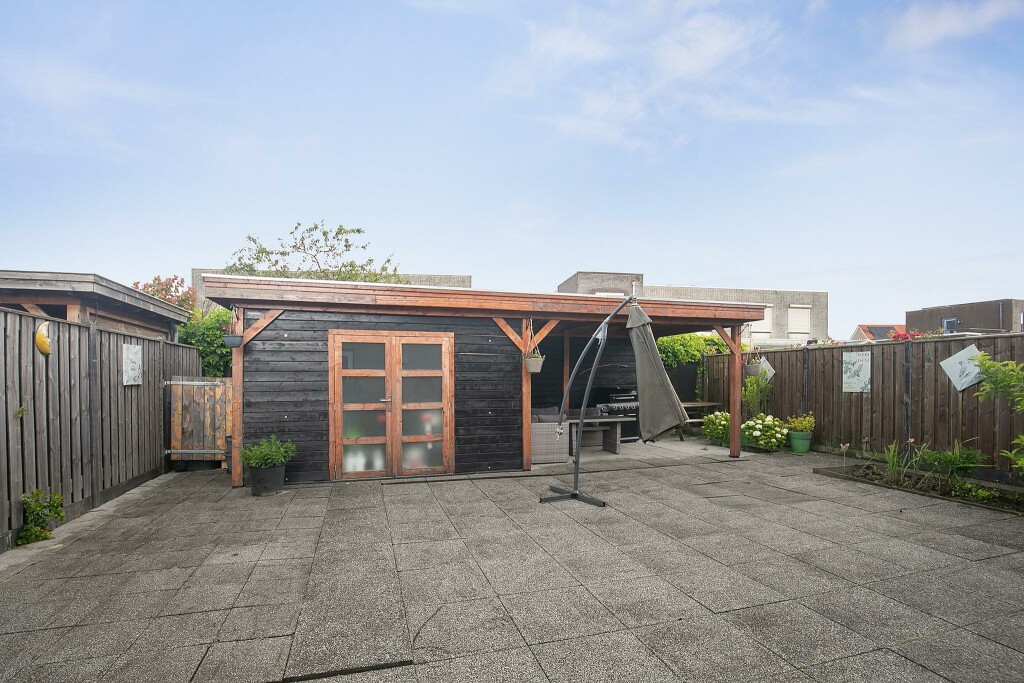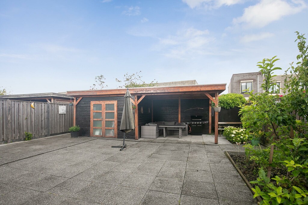 The backyard is located on the northeast. It is a delightful place to relax! The garden is low-maintenance with mostly a terrace and a few plant borders. At the back of the garden is a wooden shed with a canopy.