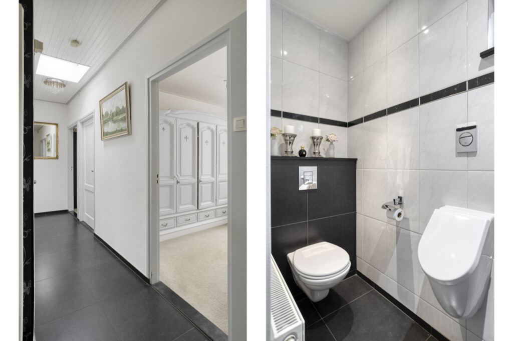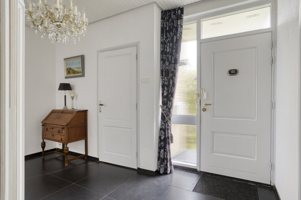 Binnenkomst via de overdekte entree in de hal met meterkast, ruim modern toilet en toegang tot de woonkamer, dichte keuken, badkamer, 3 slaapkamers en gang naar de garage. De lichtkoepel in de gang zorgt voor een aangename lichtval.