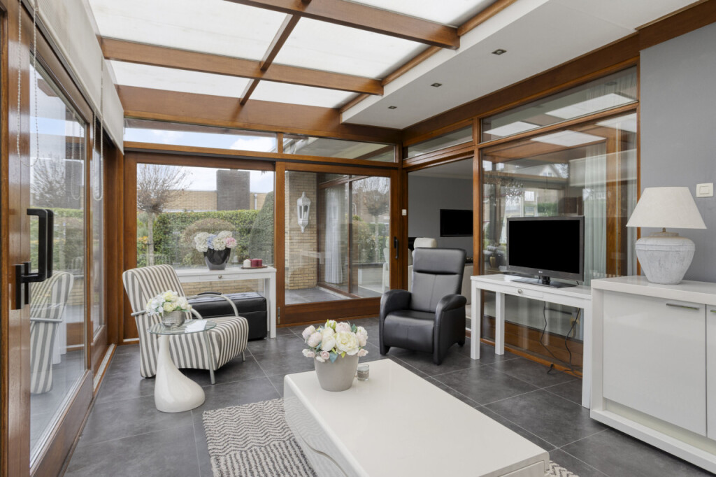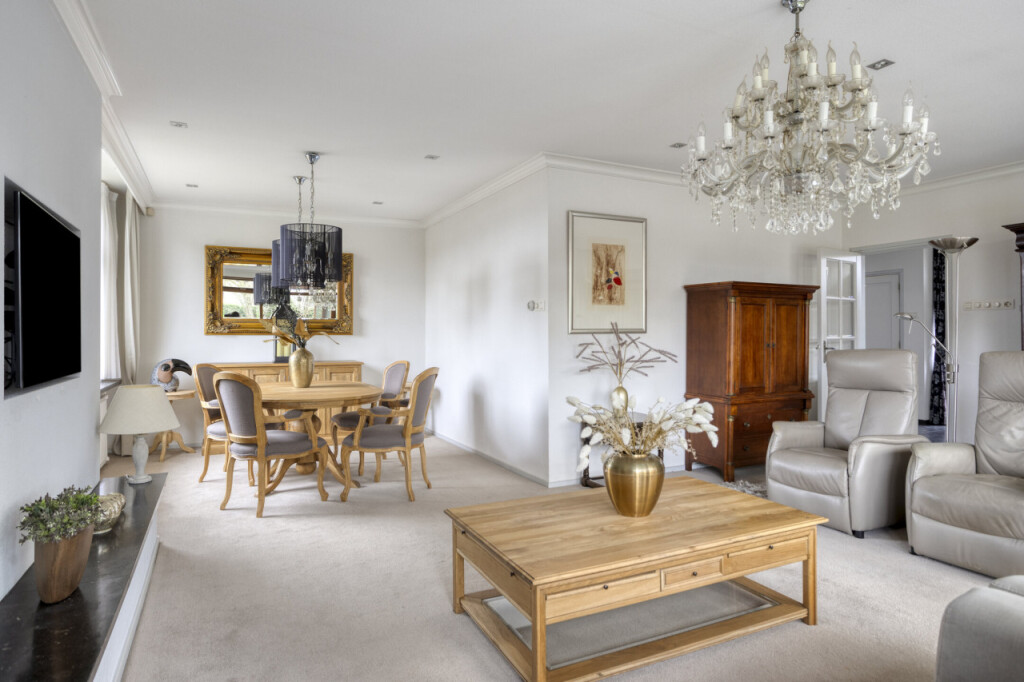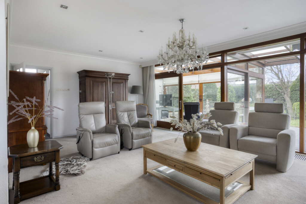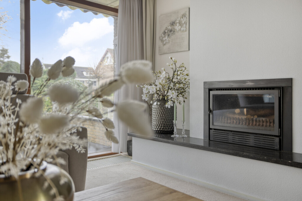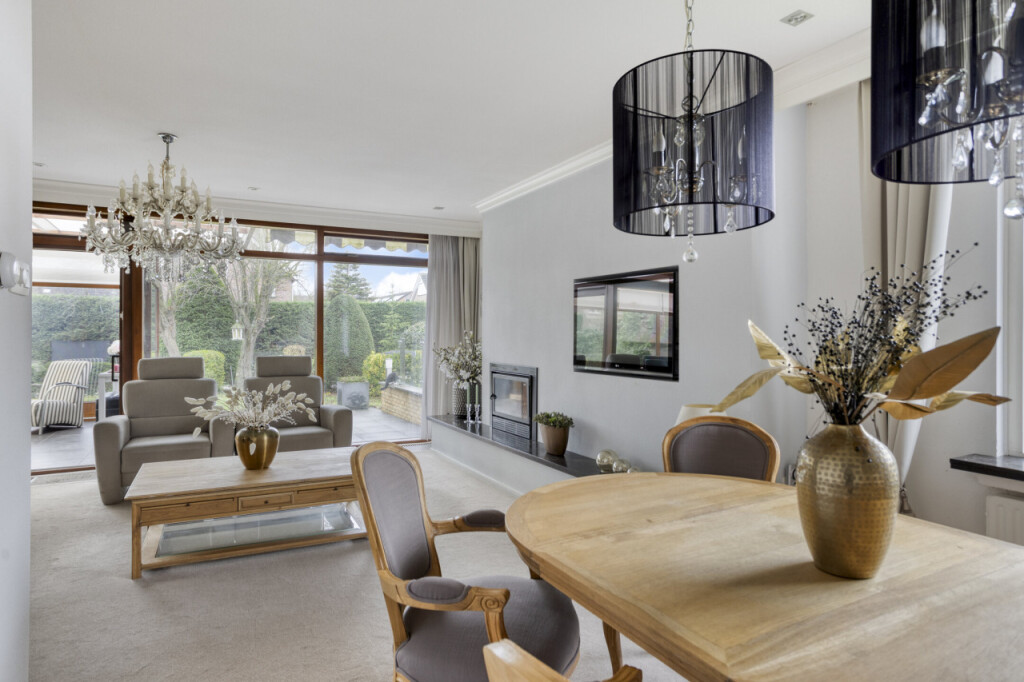 De royale woonkamer, met aangebouwde serre en sfeervolle houthaard, is aan de zuidwesten zijde van de woning gelegen biedt door de grote raampartijen veel natuurlijk licht en verbindt binnen met buiten. De aangebouwde serre geeft via de schuifpuien toegang tot het terras en de tuin.