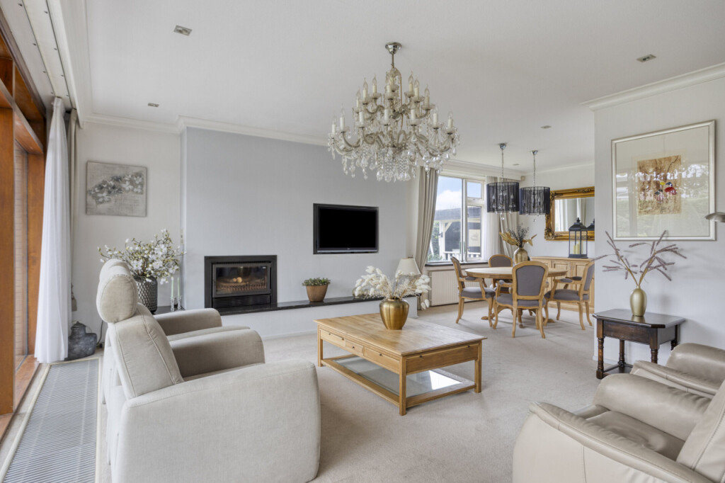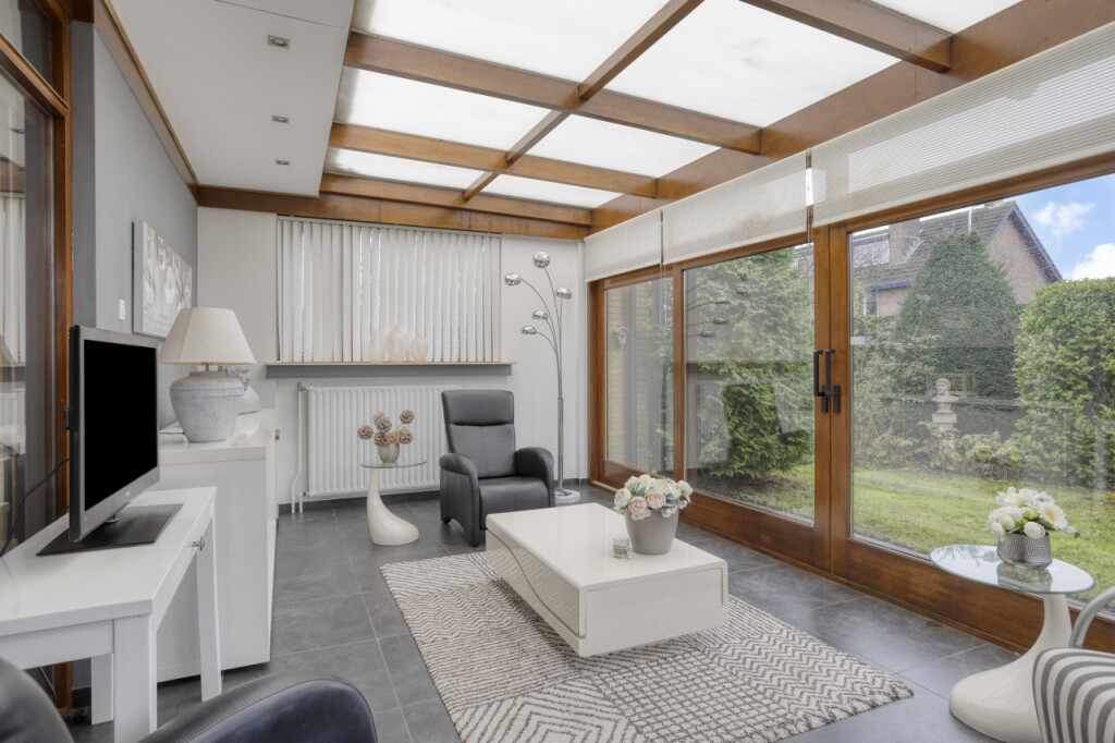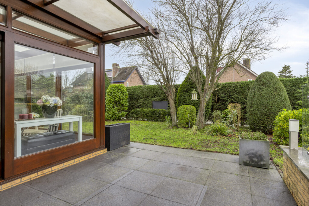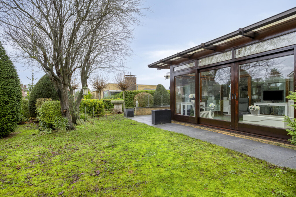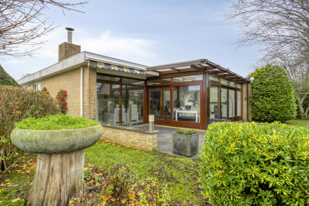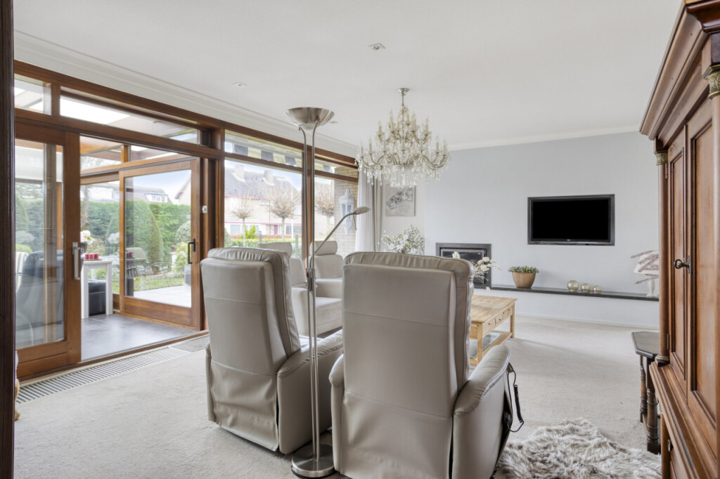 De royale woonkamer, met aangebouwde serre en sfeervolle houthaard, is aan de zuidwesten zijde van de woning gelegen biedt door de grote raampartijen veel natuurlijk licht en verbindt binnen met buiten. De aangebouwde serre geeft via de schuifpuien toegang tot het terras en de tuin.