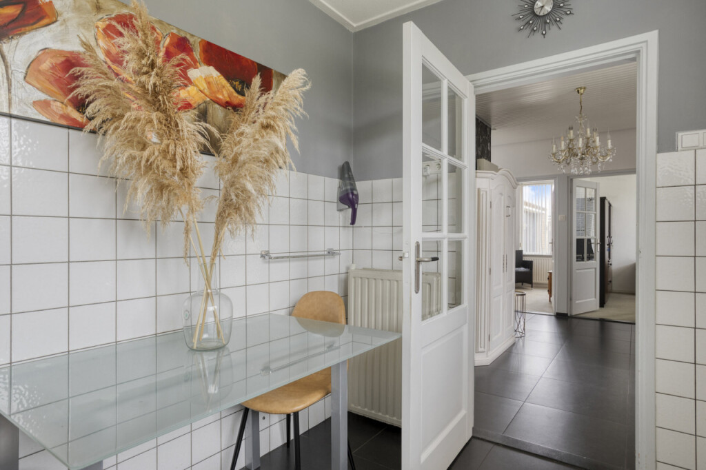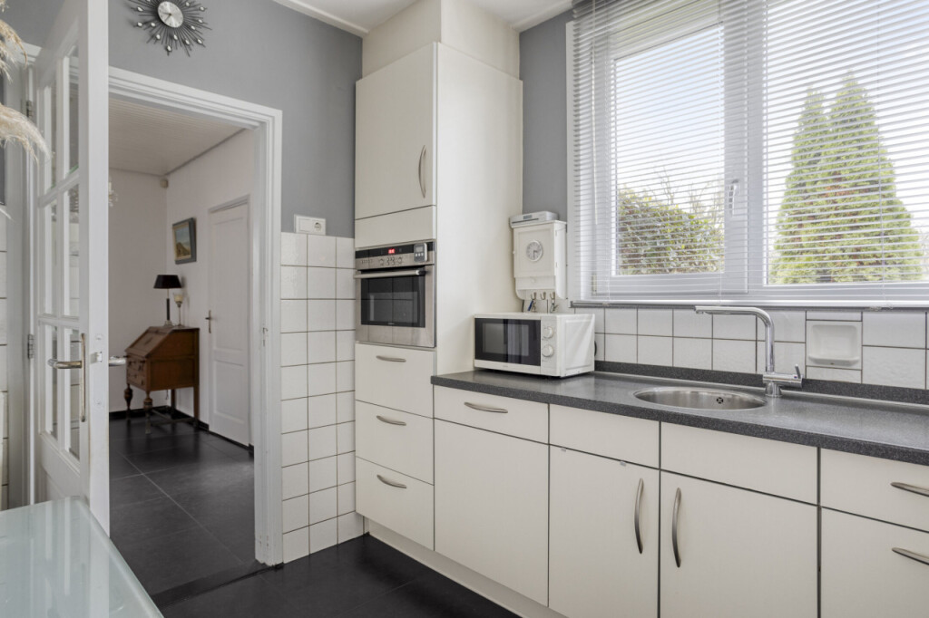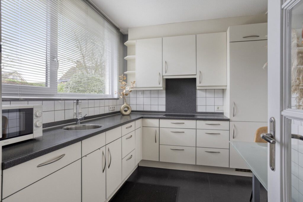 De dichte keuken is in hoekopstelling geplaatst en biedt voldoende ruimte om een ontbijttafel te plaatsen. De keuken is compleet uitgevoerd met inbouwapparatuur zoals keramische kookplaat, afzuigkap, combimagnetron, koelkast, vriezer, vaatwasmachine en close-in boiler.