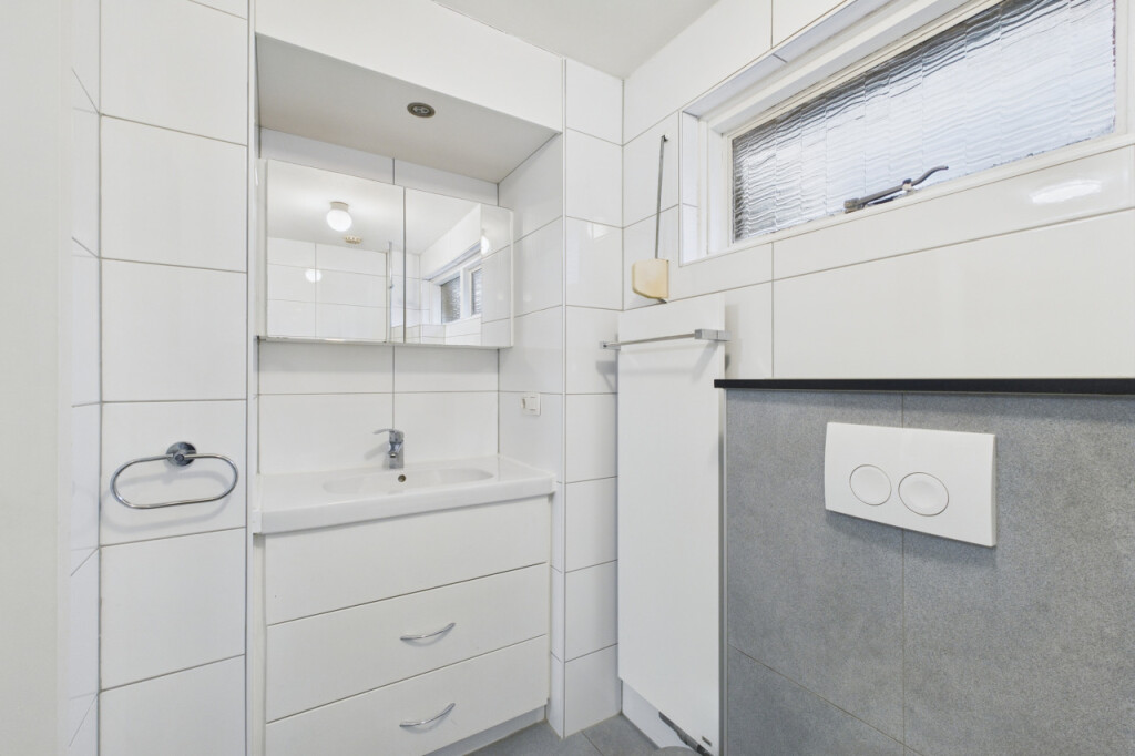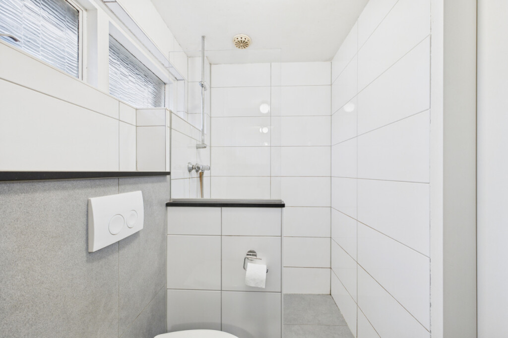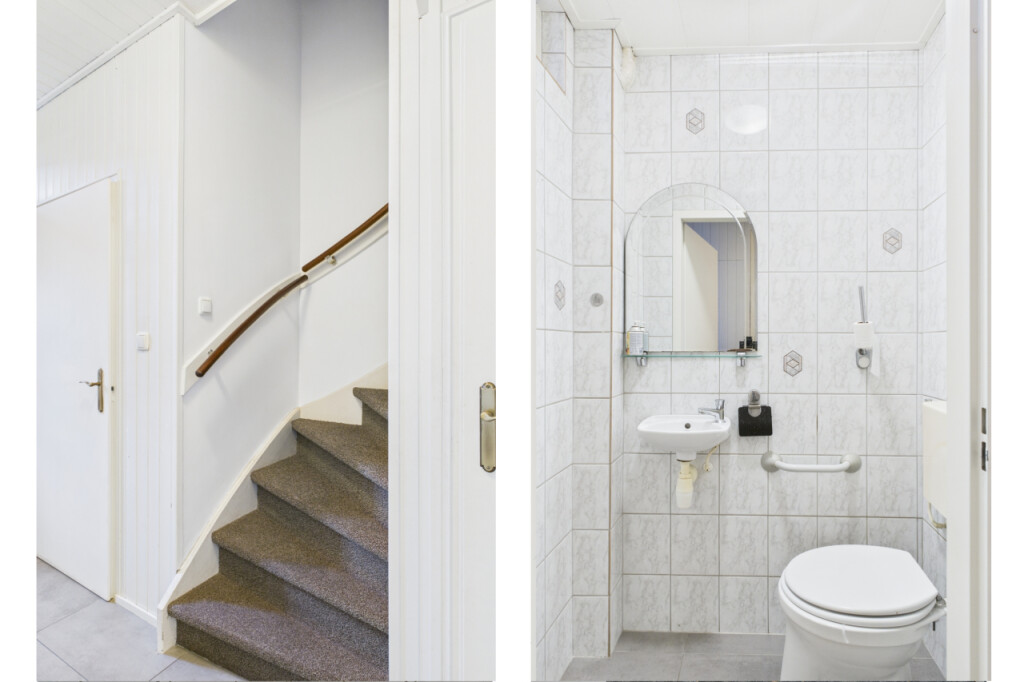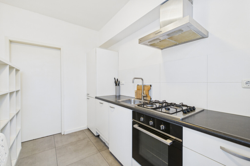 Je komt binnen in de hal met toilet en fonteintje, meterkast, provisiekast en trap naar boven. Vanuit hier loop je door naar de woonkamer. De doorzonopzet zorgt voor een prettige lichtinval aan beide zijden en geeft de leefruimte een open en aangenaam karakter. Aansluitend ligt de dichte keuken, ingericht met inbouwapparatuur en voorzien van een witgoedaansluiting. De indeling is praktisch en overzichtelijk, met directe verbinding naar de tuin.