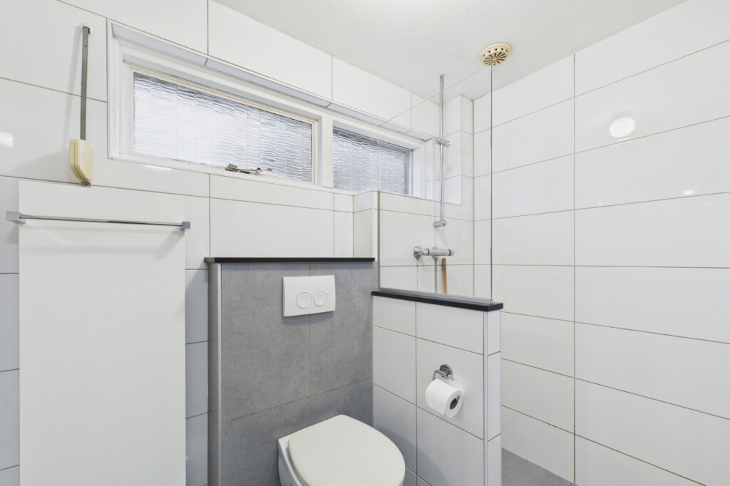 Op de eerste verdieping geeft de overloop toegang tot drie slaapkamers, waarvan één met een vaste kast. De kamers zijn goed in te delen als slaap-, werk- of hobbyruimte. De badkamer is compleet uitgevoerd met een douche, toilet en wastafel met meubel en is functioneel ingericht.