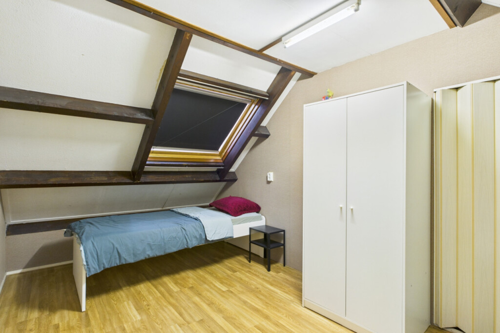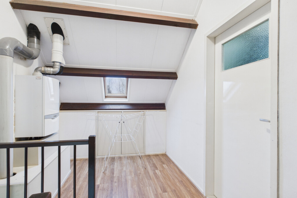 De tweede verdieping is bereikbaar via een vaste trap. Hier vind je een overloop met de cv-opstelling en twee vaste bergingen, ideaal voor het opbergen van seizoensspullen. Daarnaast is hier de vierde slaapkamer gerealiseerd, een volwaardige kamer die ook prima kan dienen als werk- of logeerkamer.