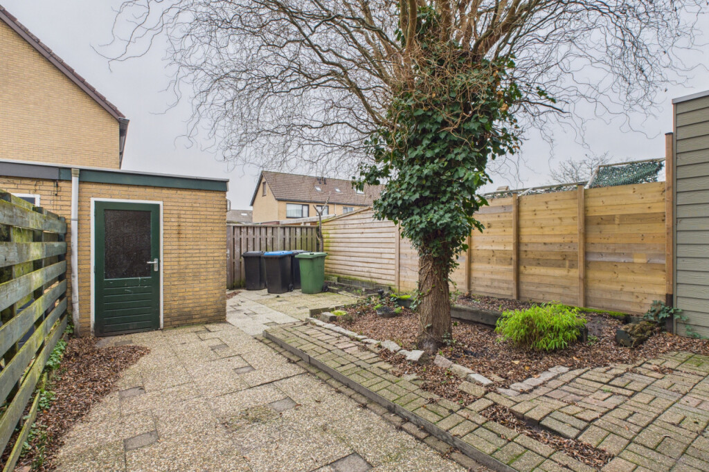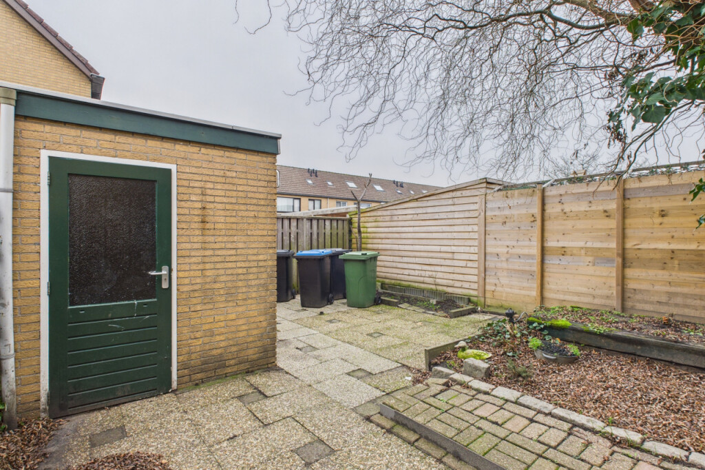 De achtertuin is onderhoudsarm aangelegd en gericht op het noordoosten, waardoor je hier al vroeg op de dag van de zon kunt genieten. Dankzij de vrije achterom is de tuin ook handig bereikbaar met fietsen of containers. Achterin staat een stenen berging die zorgt voor extra opslagruimte voor gereedschap en tuinspullen.