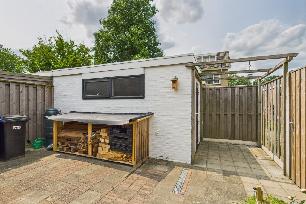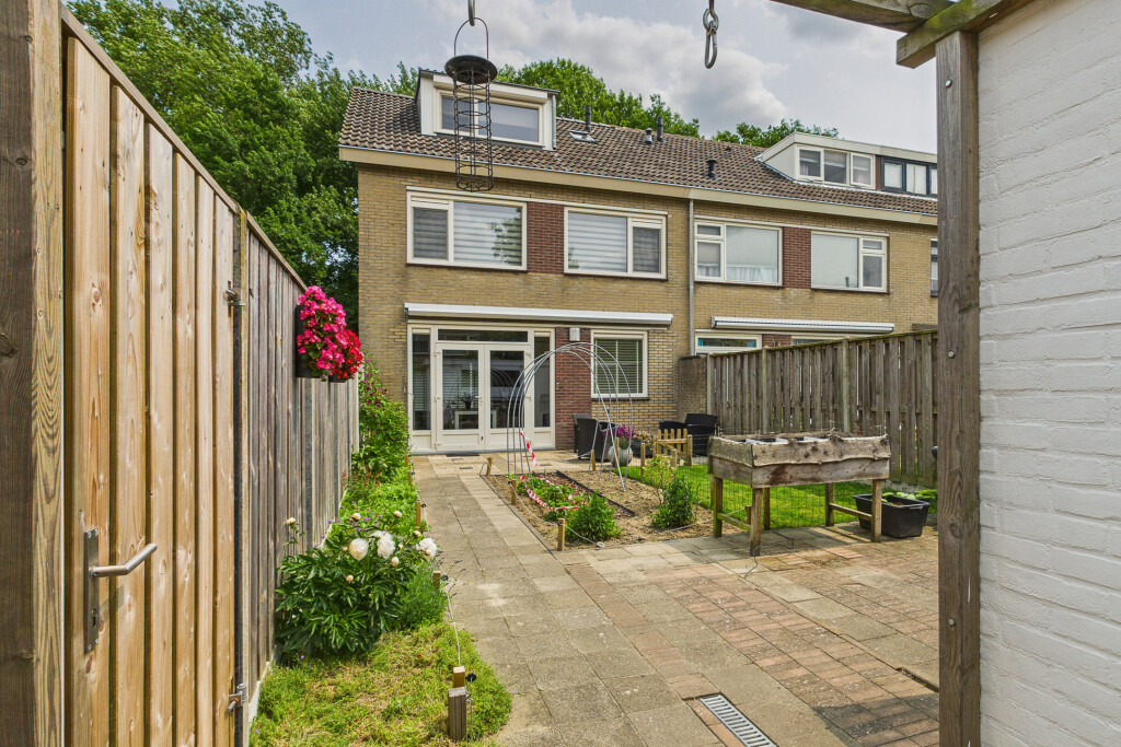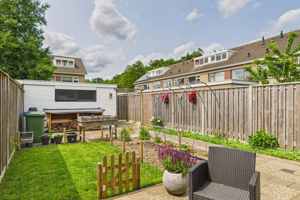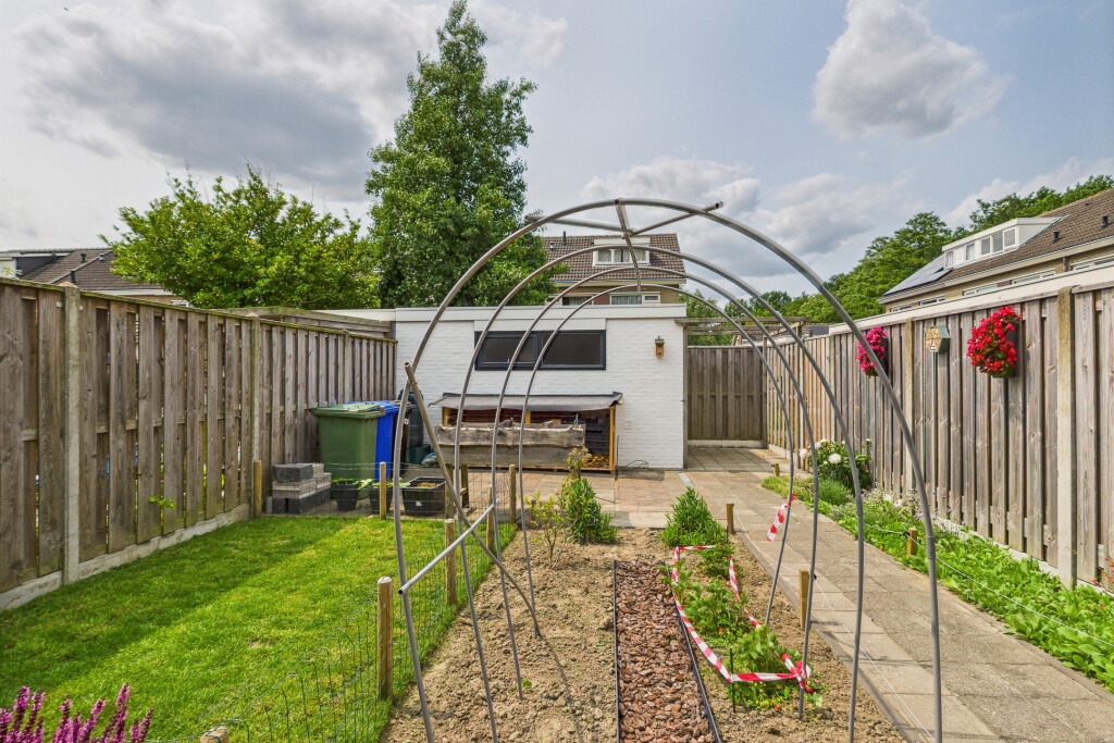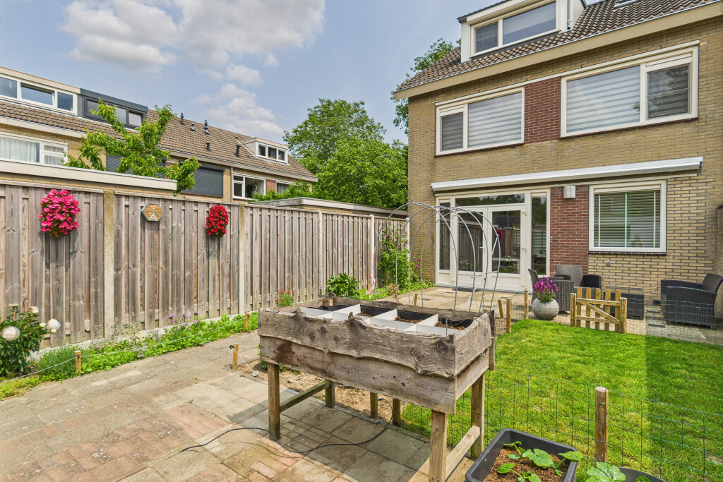 De achtertuin is verzorgd aangelegd met twee terrassen, een stukje gazon en een stenen berging. Dankzij de gunstige ligging op het westen heb je hier vrijwel de hele dag zon. De tuin beschikt bovendien over een eigen achterom, wat zorgt voor extra gemak.