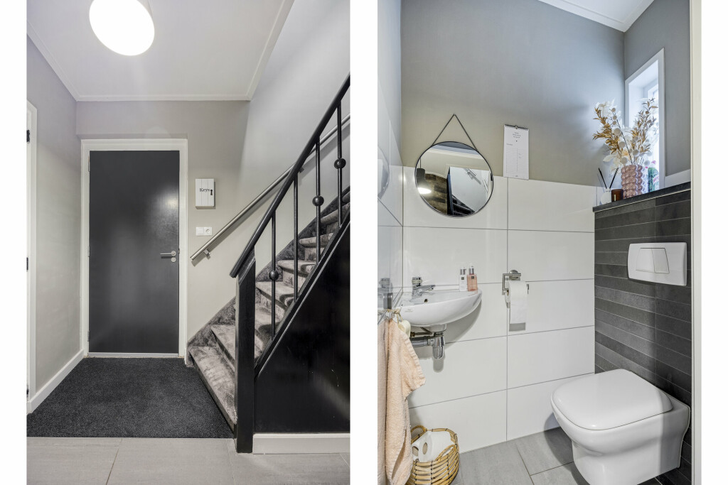 De toiletruimte is half betegeld en voorzien van hangtoilet en fonteintje. Via de hal heb je toegang tot de woonkamer en keuken.