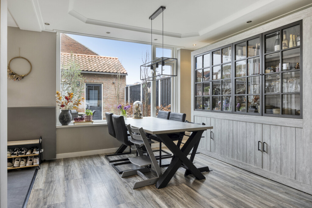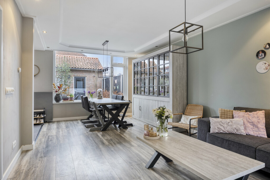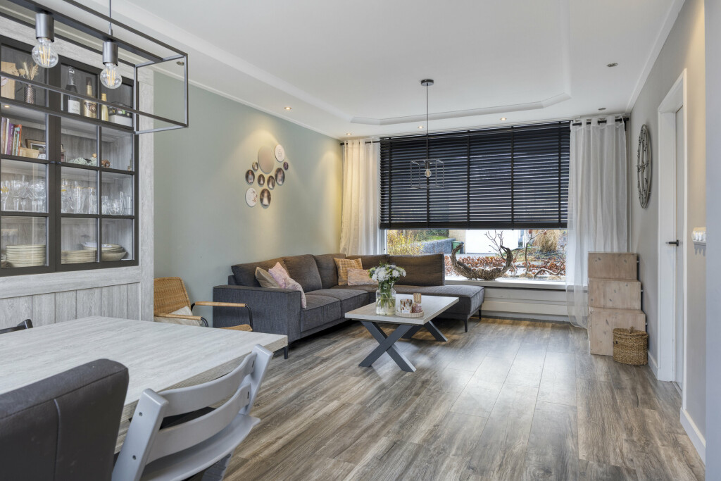 De doorzonwoonkamer is voorzien van een laminaatvloer, inbouwspots en rolluiken. Aan de voorzijde van de woning is het zitgedeelte gesitueerd en aan de achterzijde het eetgedeelte, aangrenzend aan de keuken.