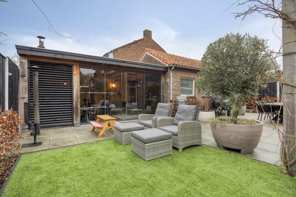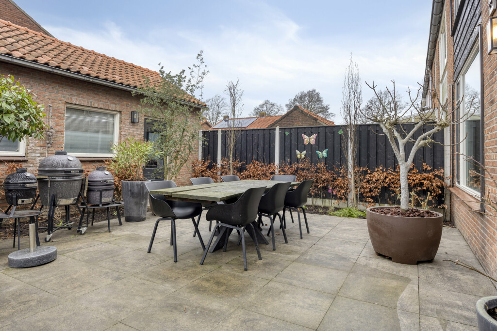 De tuin is gelegen op het noordwesten en voorzien van tuintegels, diverse terrassen, borders met sierbeplanting, kunstgazon en 2x een achterom.