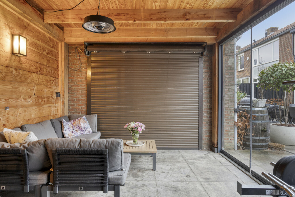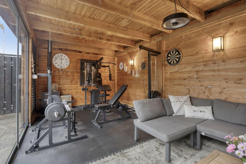 Aangrenzend aan de berging is in 2021 een houten overkapping geplaatst, die voorzien is van een tegelvloer, elektra, een sfeervolle houtkachel en kan afgesloten worden met glazen schuifpanelen, zodat het er zowel in de zomer als in de winter heerlijk toeven is.