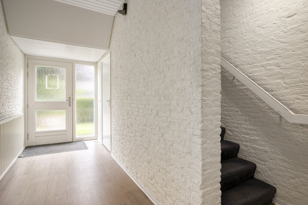Entree in de hal met meterkast, toilet met fonteintje en trap naar de verdieping.