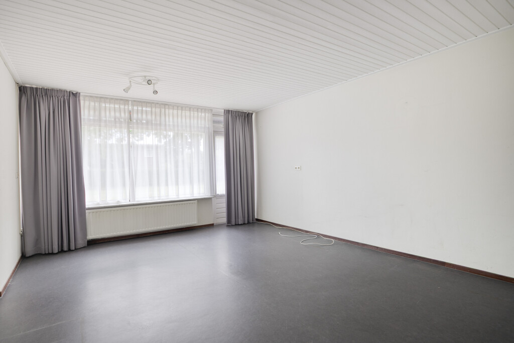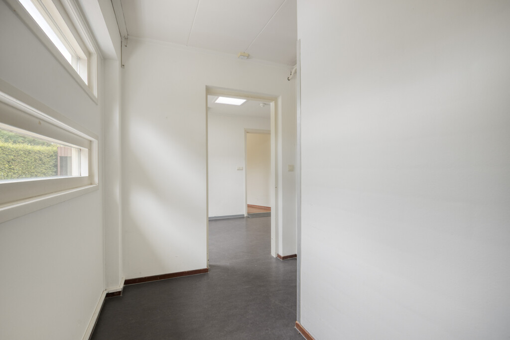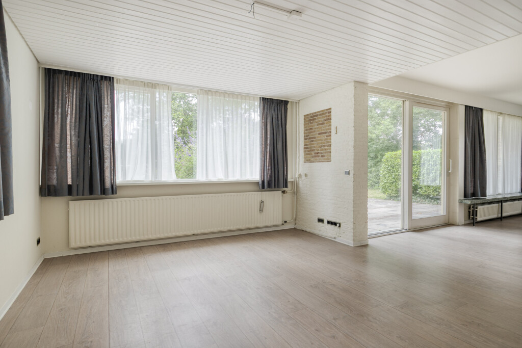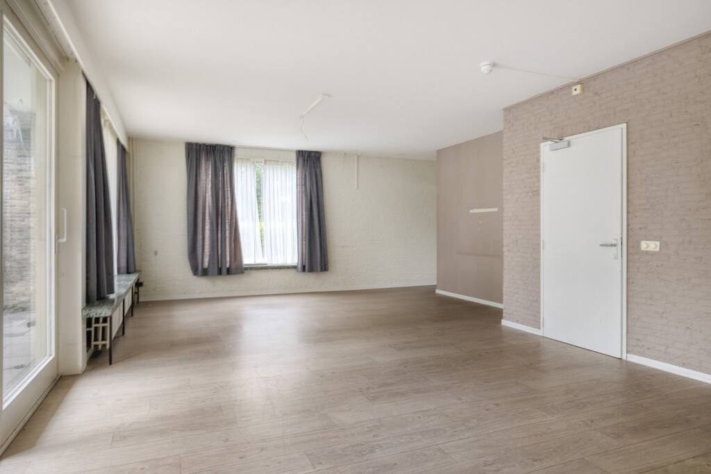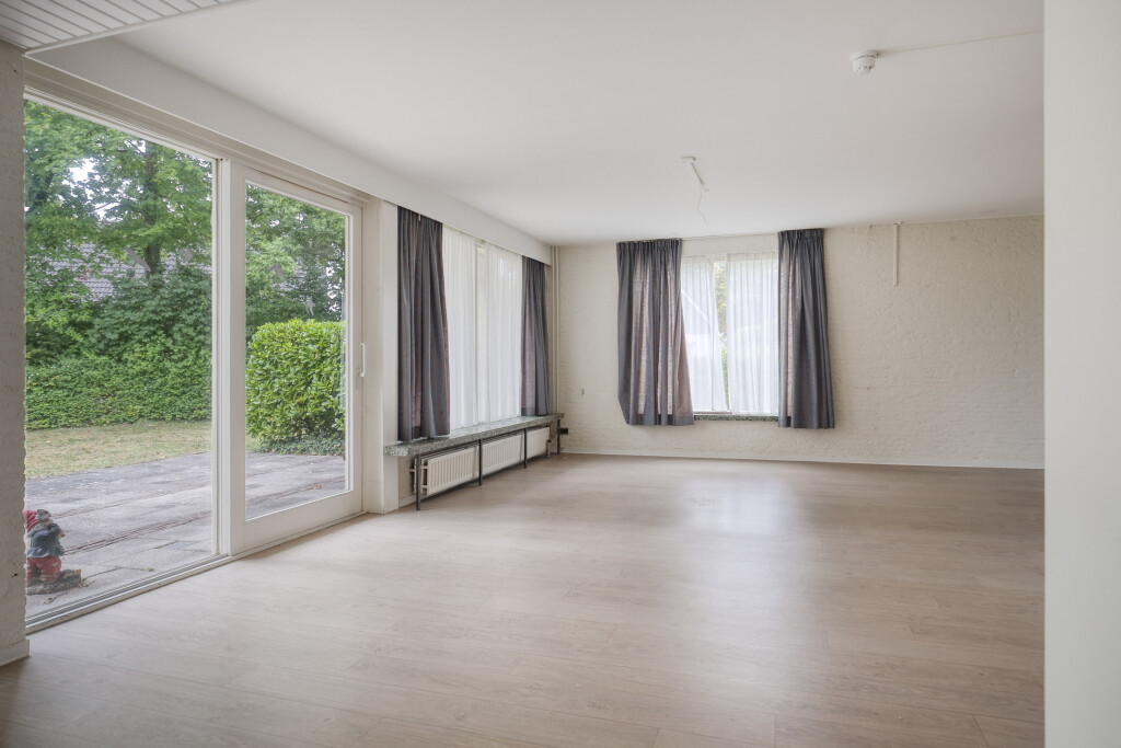 De riante woonkamer, met zicht op de tuin, is verdeeld in een heerlijke zithoek en open eetkamer. De schuifpui en grote ramen zorgen voor een ideale verbinding tussen binnen en buiten. Aansluitend aan de zithoek is een werk-/studeerkamer te vinden.