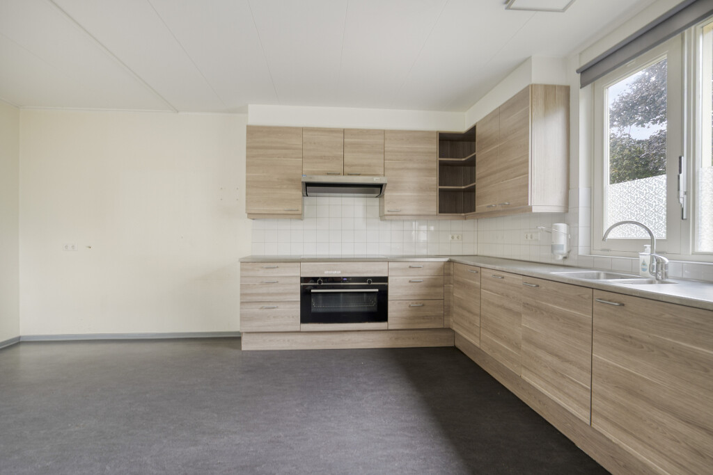 Vanuit de eetkamer is er toegang tot de dichte woonkeuken, waar een nette complete hoekopstelling is geplaatst met inbouwapparatuur zoals inductiekookplaat, afzuigkap, oven, combimagnetron, koelkast en vaatwasmachine. De woonkeuken heeft een oppervlakte van 20m² en biedt vele mogelijkheden om hier je droomkeuken te realiseren.