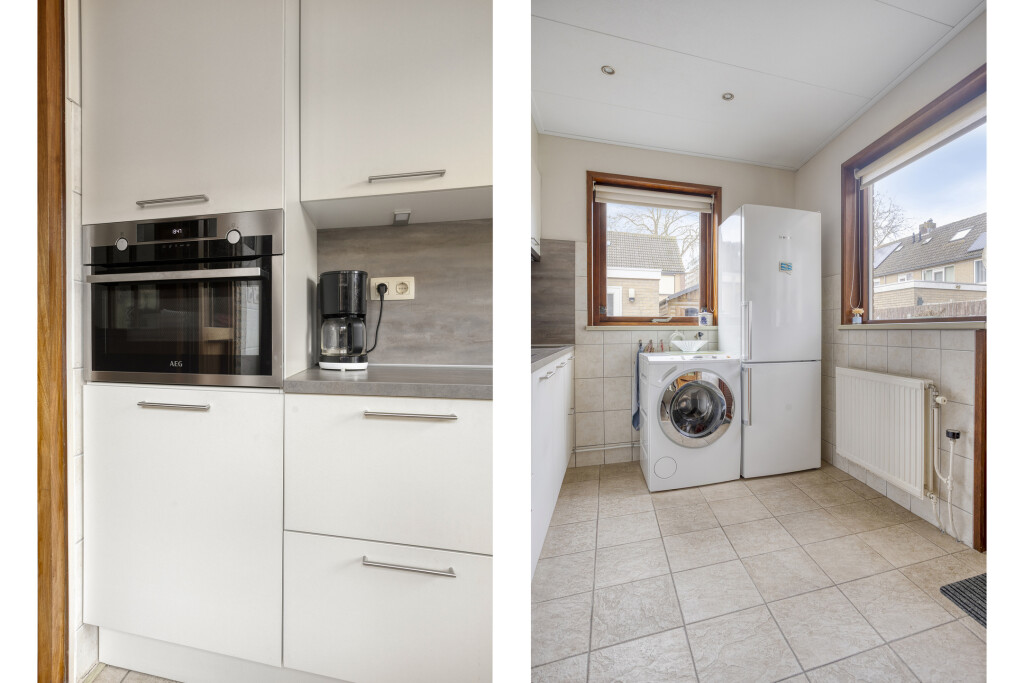 De woning is uitgebouwd aan de achterzijde en daar is de keuken gesitueerd. De keuken is in 2021 vernieuwd en opgesteld in een rechte wandopstelling en voorzien van een tegelvloer. De inbouwapparatuur omvat: