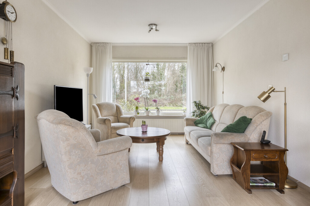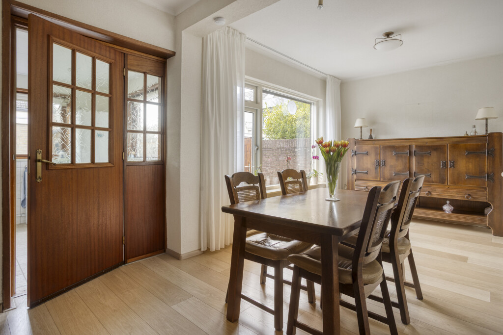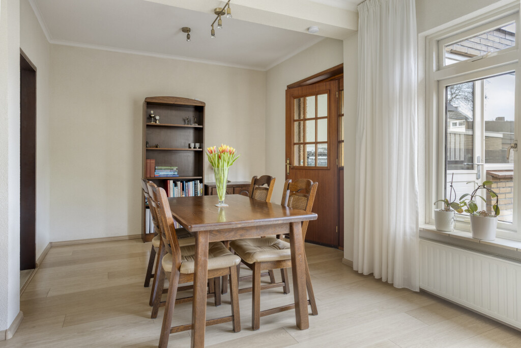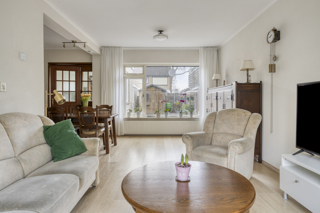 De woonkamer heeft een laminaatvloer en heeft het zitgedeelte aan de voorzijde van de woning en het eetgedeelte aan de achterzijde van de woning. De ramen zijn voorzien van een rolluik voor extra privacy.