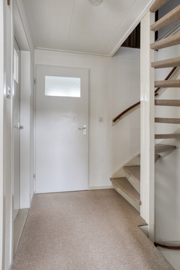 Entree via de hal met meterkast, vernieuwde toiletruimte en trapopgang naar eerste verdieping. Het toilet is half betegeld en voorzien van fontein.