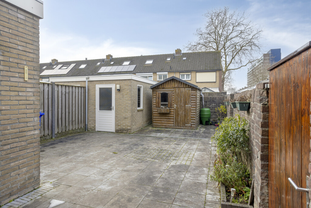 De ruime achtertuin is onderhoudsvriendelijk aangelegd. Achterin de tuin staat een vrijstaande stenen berging die geschikt is voor de fietsen en tuinmeubilair. Ook het houten tuinhuis biedt opbergmogelijkheden. Via een poort is de brandgang bereikbaar.