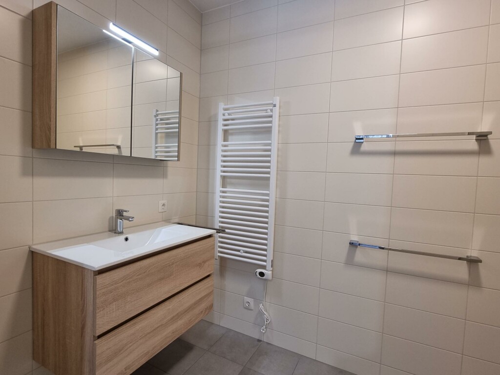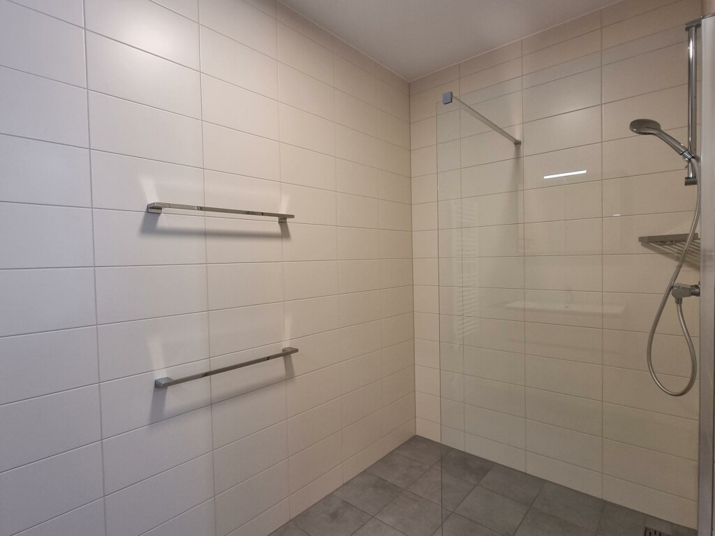 De badkamer is geheel betegeld en voorzien van een inloopdouche, wastafel en wastafelmeubel.