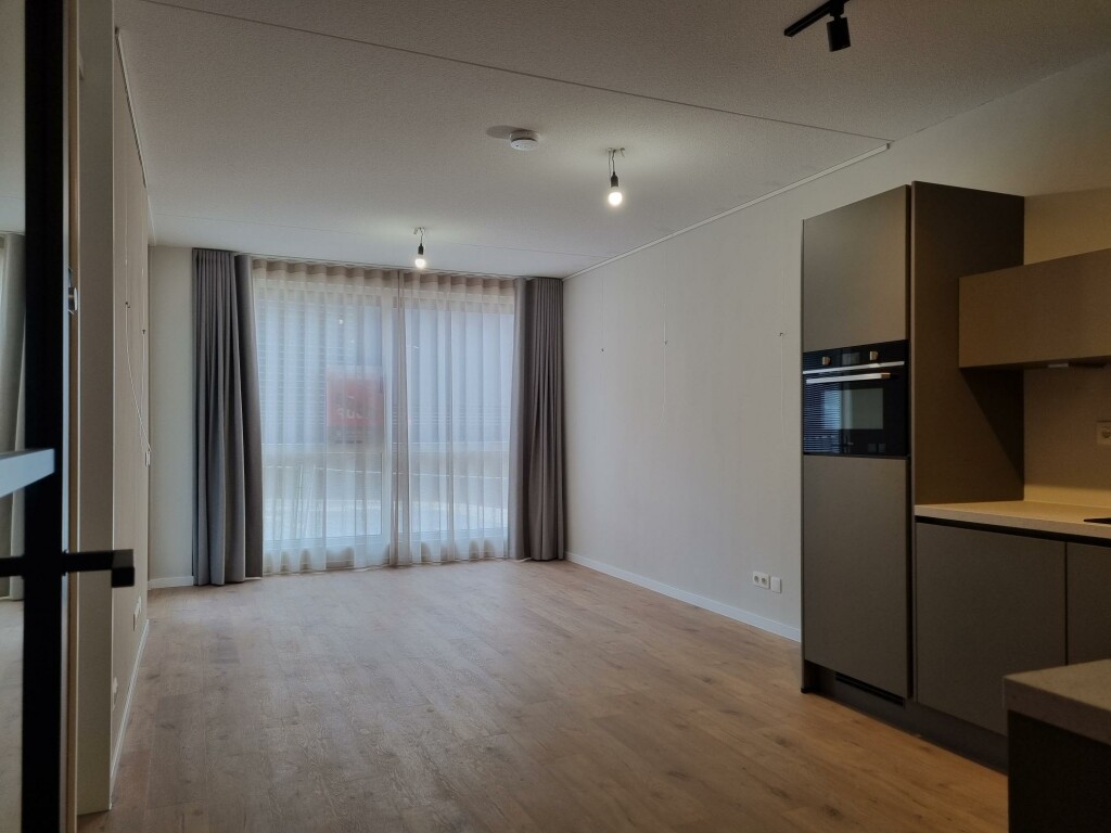 Dit appartement heeft een indeling met een woon- en eetkamer/keuken in een rechthoekige vorm.