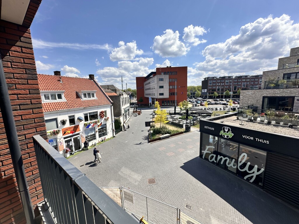 De ligging van het balkon ligt op het zuiden met een prachtig zicht over de Axelse Dam en het Bellevue parkje.