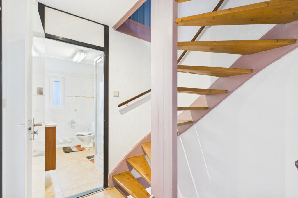 De bijkeuken is praktisch ingericht met aansluitingen voor witgoed en de opstelling van de cv-ketel. Daarnaast is hier het toilet met fonteintje gesitueerd. Vanuit deze ruimte loop je zo de achtertuin in.