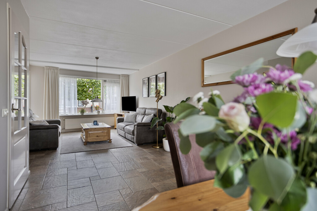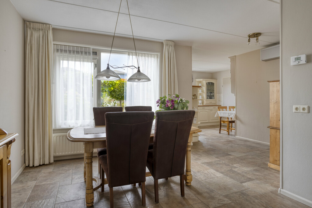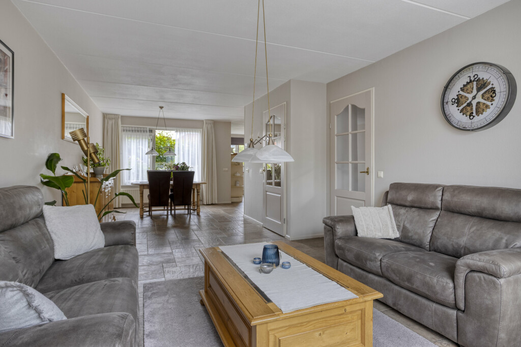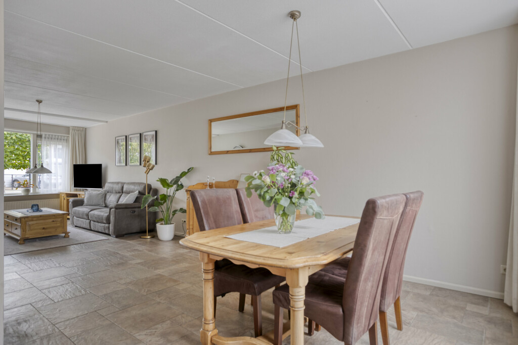 De lichte en royale woonkamer is voorzien van een tegelvloer, diverse raampartijen met veel natuurlijk daglicht. Aan de voorzijde van de woning is het zitgedeelte gecreëerd, aan de achterzijde het eetgedeelte. De ruimte is uitgerust met een airco-unit, die kan koelen op warme dagen en verwarmen op koudere dagen.