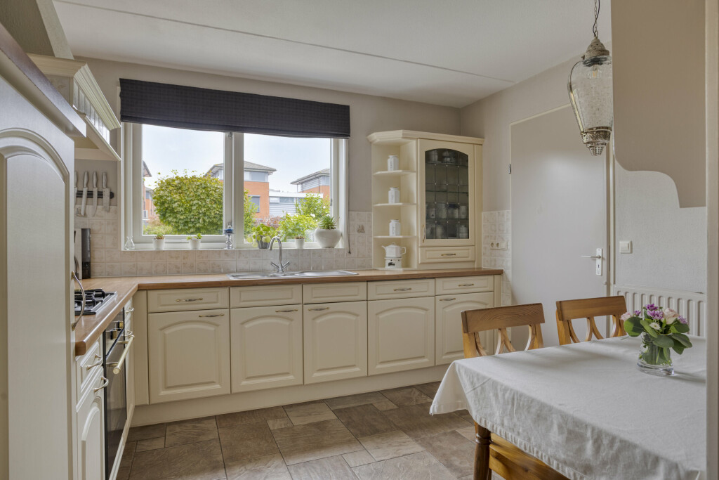 De open keuken is uitgevoerd in een hoekopstelling en is voorzien van alle inbouwapparatuur. Aansluitend is de bijkeuken en heb je toegang tot de garage en de achtertuin.