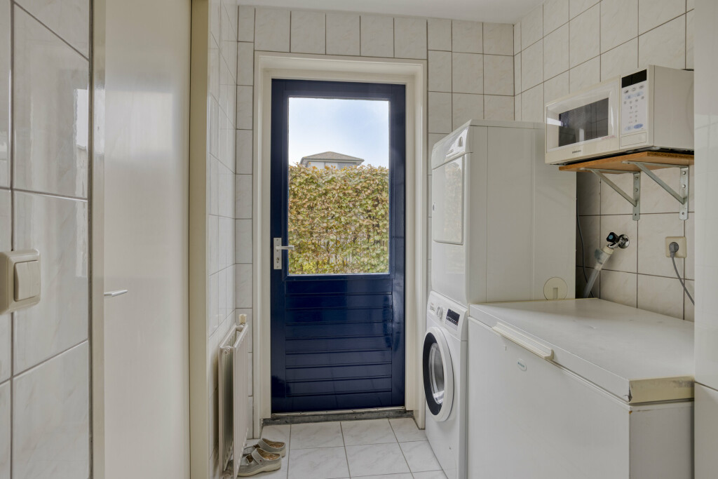 De bijkeuken is volledig betegeld en voorzien van de aansluiting voor de wasapparatuur. Daarnaast is er nog voldoende ruimte voor het plaatsen van een extra koelkast of vriezer.