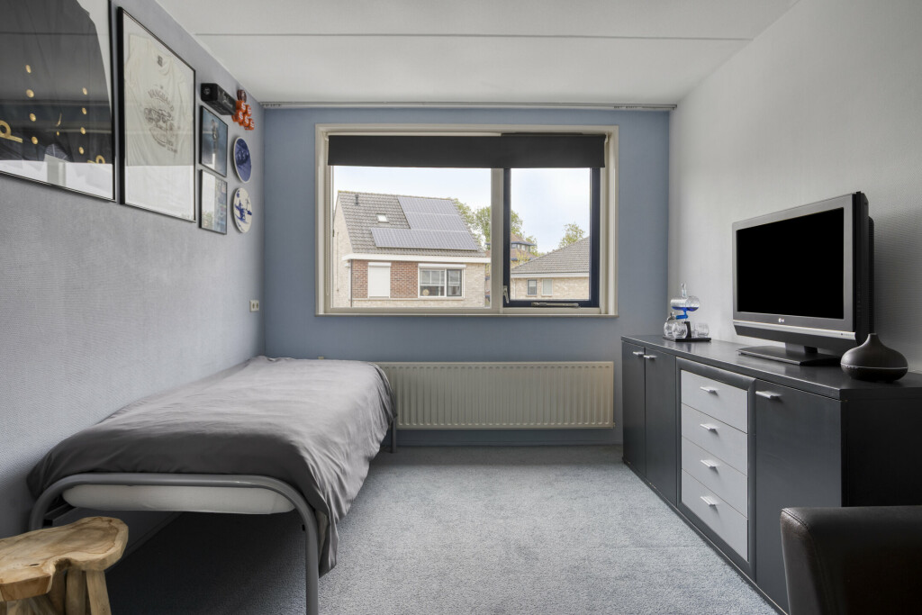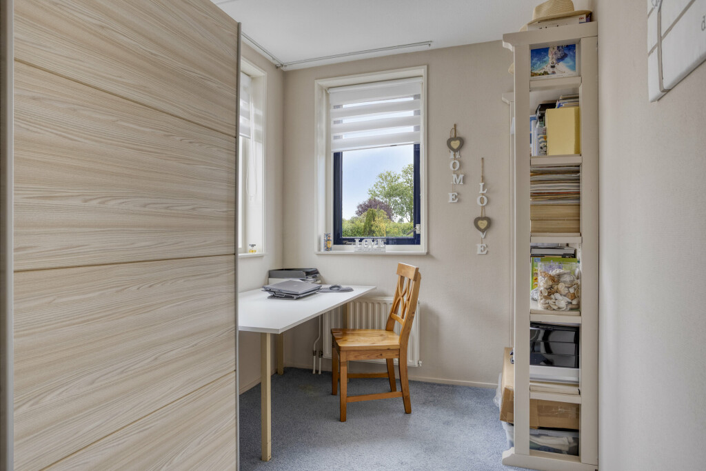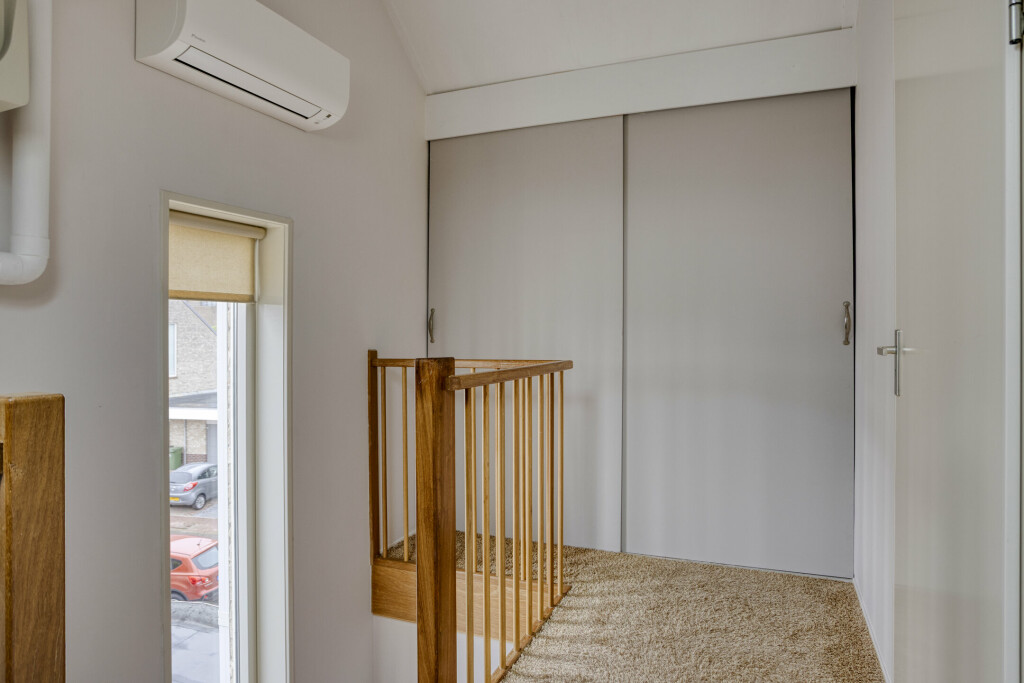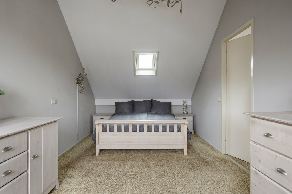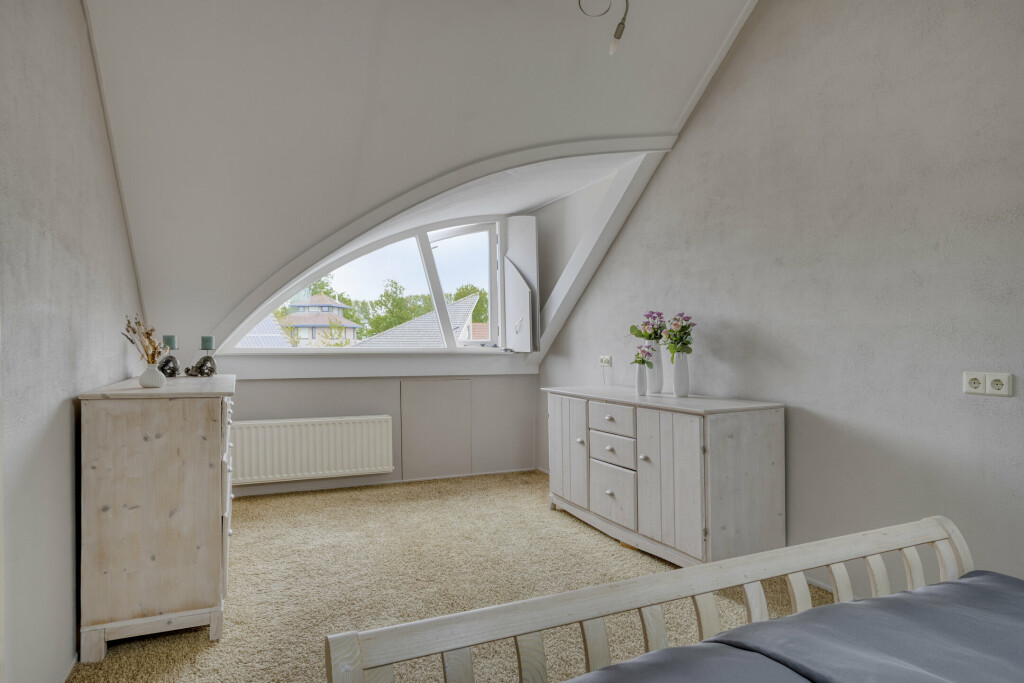 Via een vaste trap is de tweede verdieping bereikbaar. Er bevinden zich een overloop met velux raam, vaste kastenwand voor het opbergen van niet alledaagse spullen en beschikt over een airco-unit, die zowel kan koelen als verwarmen. Aansluitend is de 4e slaapkamer, welke voorzien is van vloerbedekking, velux raam en speels halfrond raam.