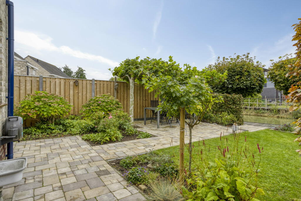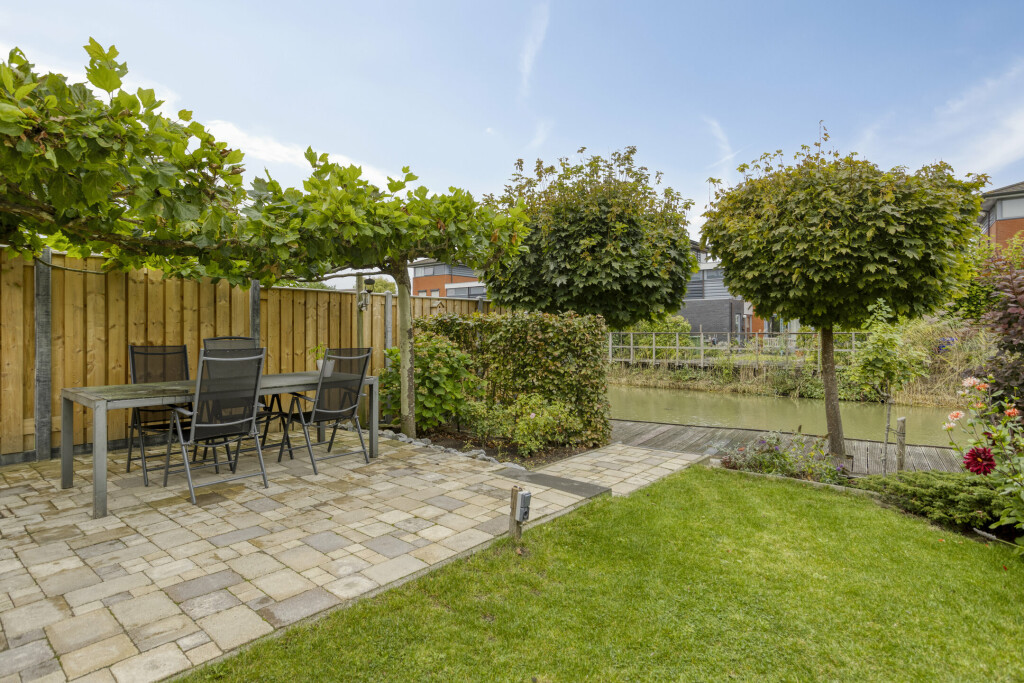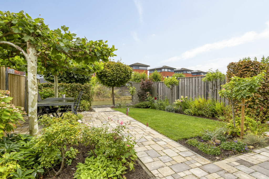 De fraai aangelegde achtertuin is gelegen op het zuidwesten en is voorzien van diverse terrassen, gazon, borders met sierbeplanting en bomen. De tuin grenst direct aan het water, wat zorgt voor een vrij en groen uitzicht en een gevoel van rust. Het is een heerlijke plek om te ontspannen of te genieten van een drankje aan de waterkant.
