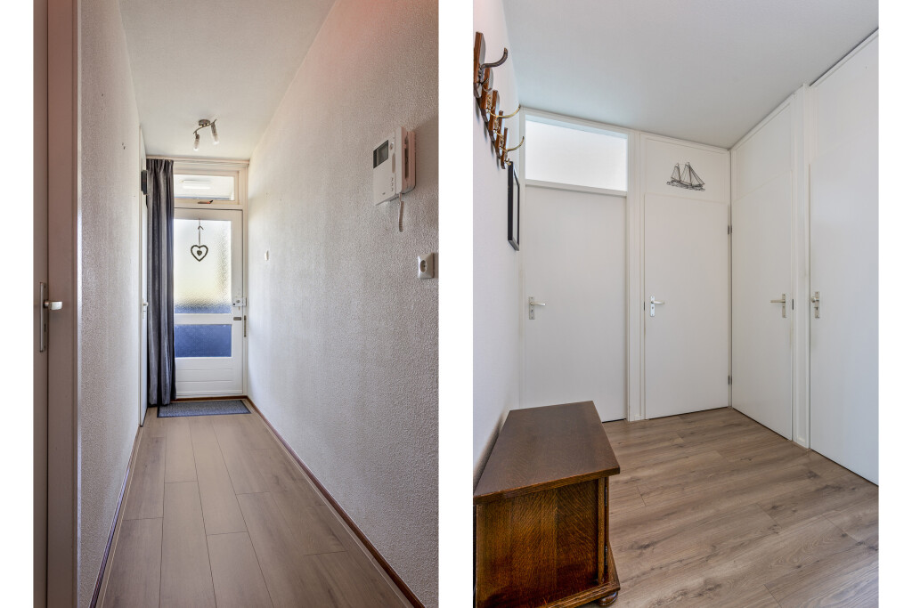 Entree van het appartement via de hal voorzien van meterkast, een praktische berging en het toilet met fontein. Vanuit de hal zijn de slaapkamers, badkamer en woonkamer te bereiken.
