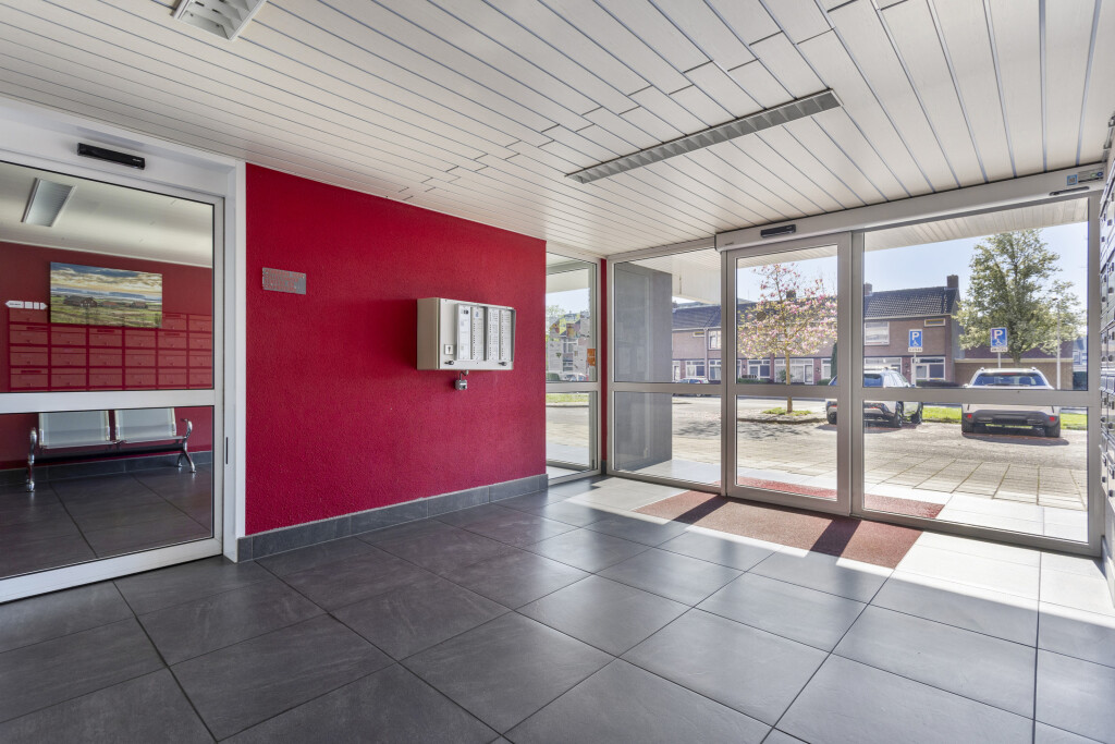 Entree van het complex via de centrale hal met brievenbussen en videofoon. Op de begane grond zijn de bergingen, de centrale afvalverzamelingsplaats en de toegang naar lift en trappenhuis.