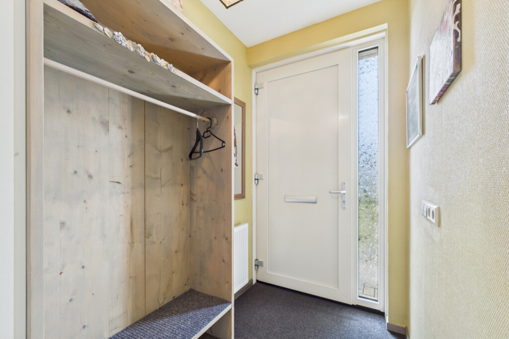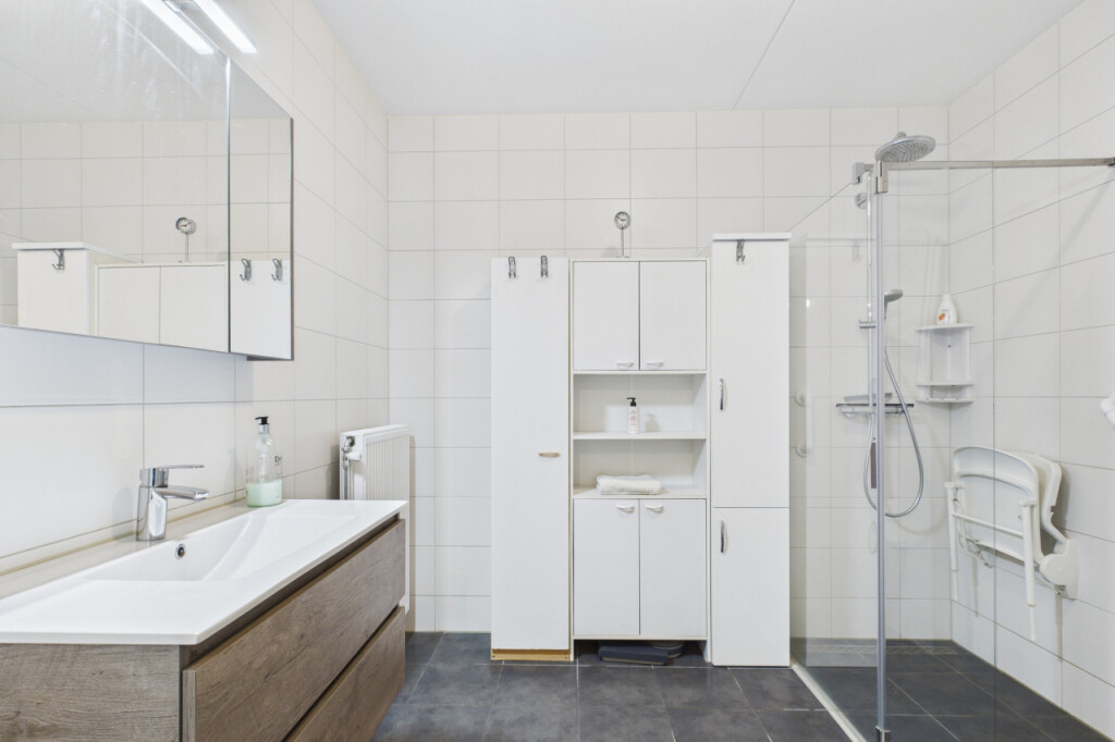 Aan de achterzijde van de woning bevindt zich het lichte en sfeervolle woongedeelte met aansluitend de serre, waar je via een schuifpui het balkon bereikt: een heerlijke plek om te genieten! Op de begane grond bevindt zich verder een royale slaapkamer en de moderne badkamer met inloopdouche, wastafelmeubel en toilet, wat gelijkvloers wonen bijzonder comfortabel maakt.