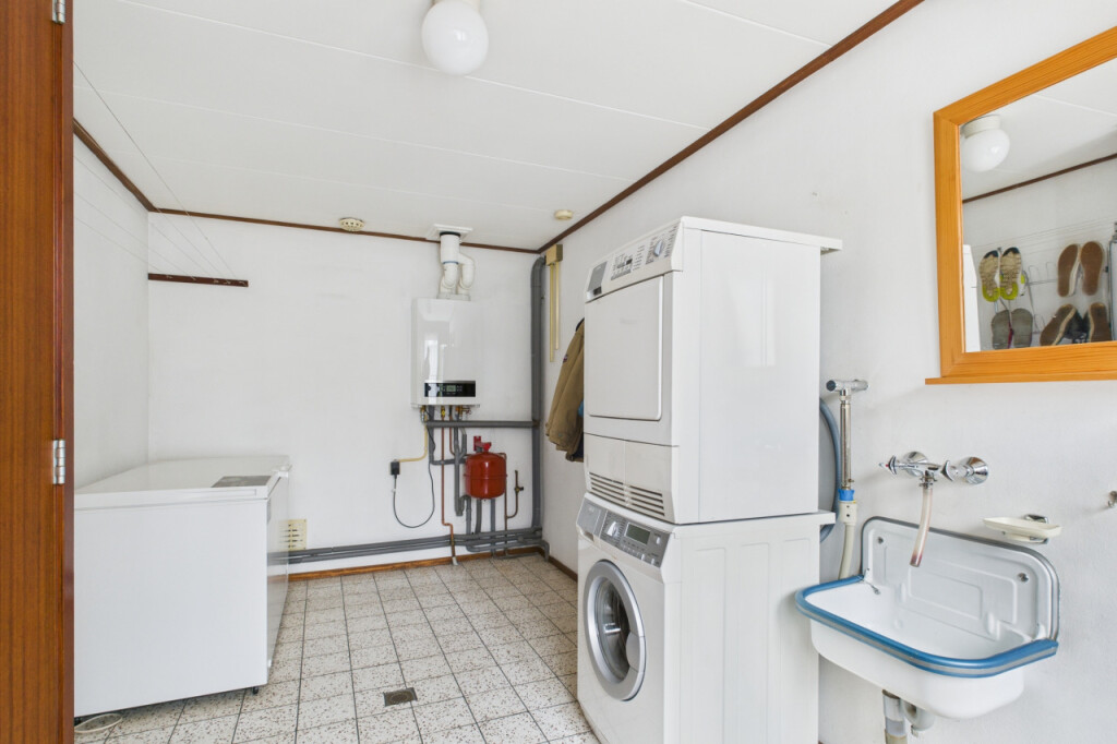 Via de entree kom je in de hal met meterkast (2014), toilet en trapopgang naar de eerste verdieping. Vanuit de hal is er toegang tot de verschillende vertrekken op de begane grond. De doorzonwoonkamer is ruim en licht en wordt extra sfeervol door de aanwezige kachel, waardoor dit een heerlijke plek is om te ontspannen. Aansluitend bevindt zich de gezellige woonkeuken, uitgevoerd in een praktische hoekopstelling en voorzien van diverse inbouwapparatuur zoals een inductiekookplaat, afzuigkap, oven en spoelbak. Vanuit de keuken is er prettig zicht op de tuin en directe toegang tot de achtergelegen bijkeuken/wasruimte, waar zich een uitstortbak en aansluitingen voor de witgoedapparatuur bevinden. Ook de nette badkamer met inloopdouche en wastafelmeubel en de comfortabele slaapkamer op de begane grond zijn vanuit de hal bereikbaar, evenals de garage.