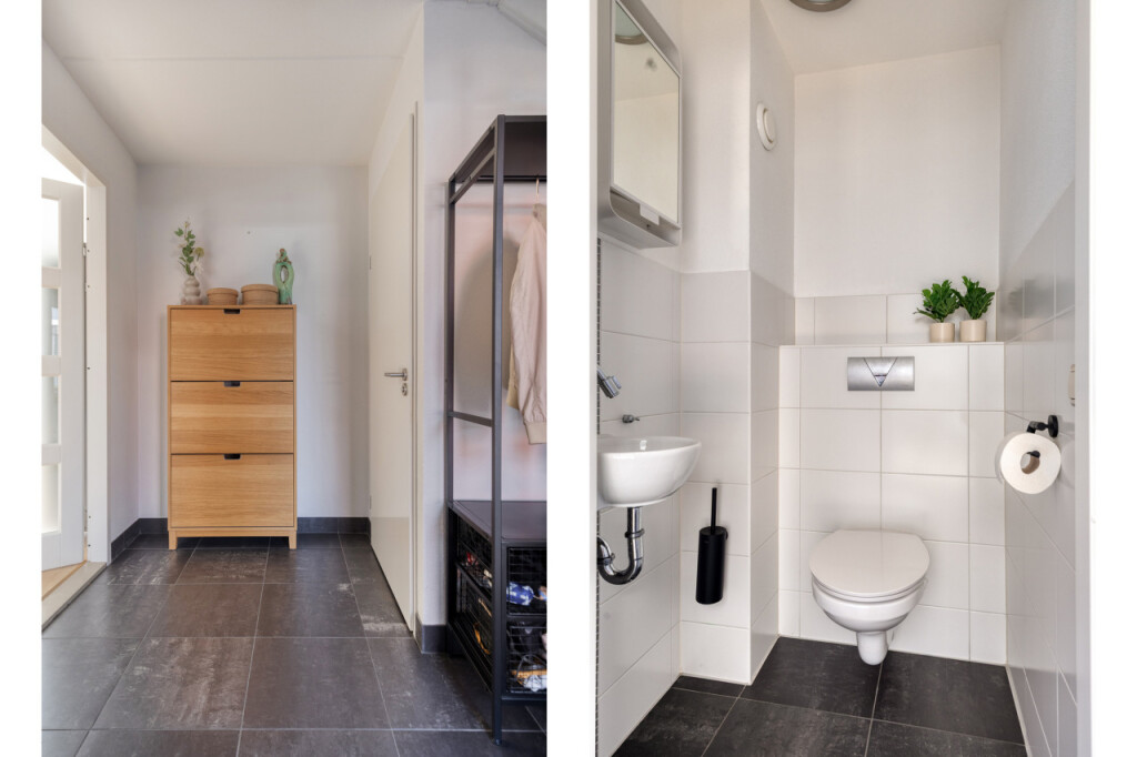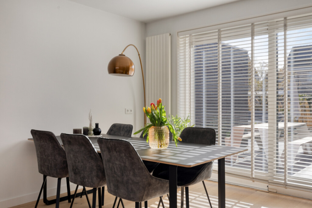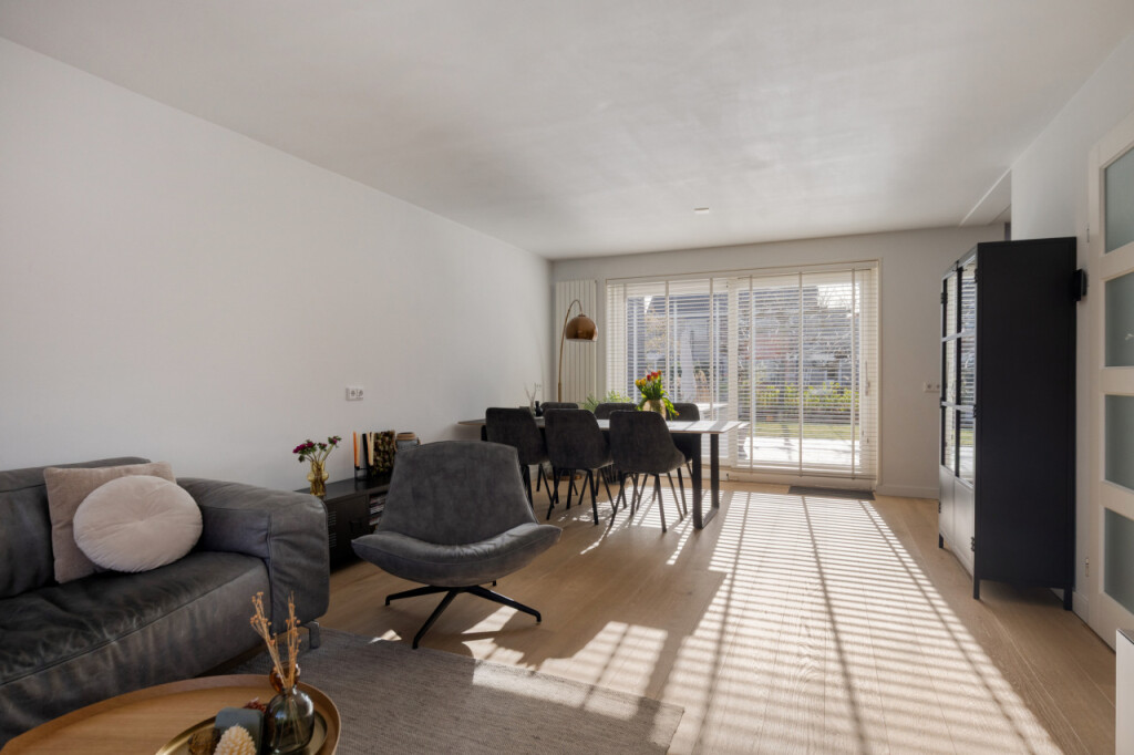Via de entree kom je in de ruime hal met toiletruimte en trapopgang naar de eerste verdieping. De lichte woonkamer biedt een prettige leefruimte met veel privacy aan de voorzijde en een directe verbinding met de tuin via de schuifpui. Hierdoor ontstaat een mooie overgang tussen binnen en buiten.