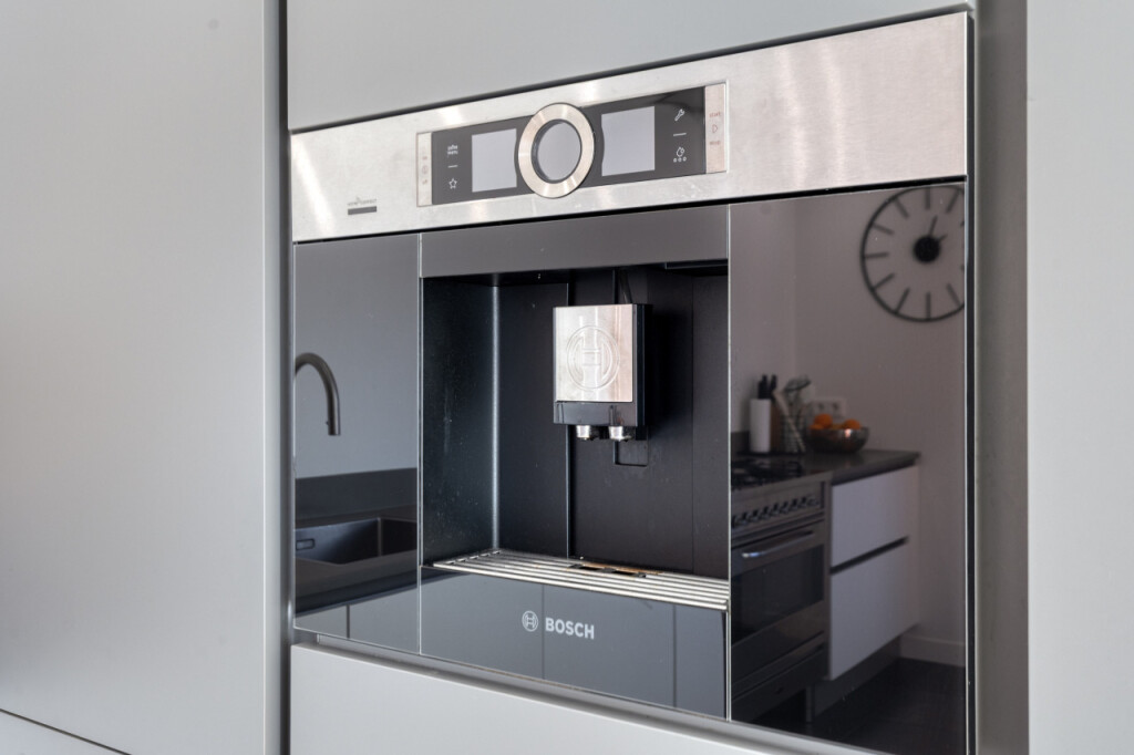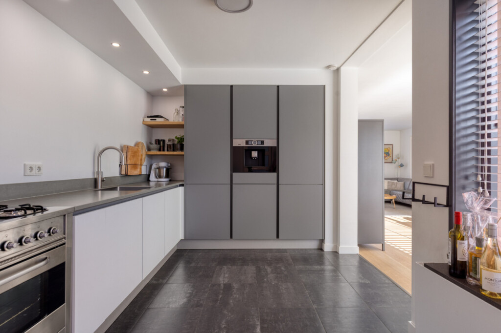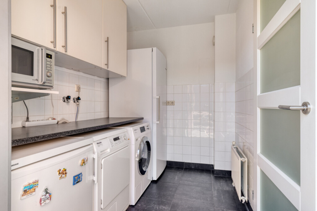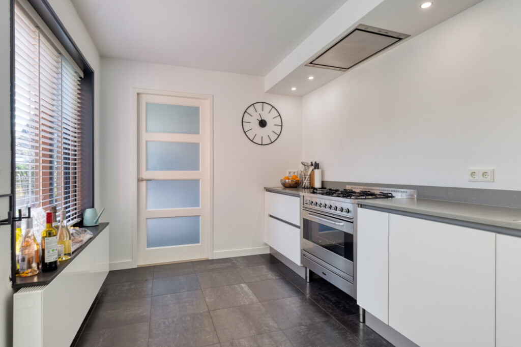De halfopen keuken is praktisch ingericht en voorzien van diverse inbouwapparatuur en voldoende bergruimte. Aansluitend bevindt zich de bijkeuken met extra kastruimte en aansluitingen voor witgoed. Vanuit hier is tevens de tuin bereikbaar. De aangebouwde, verlengde garage is via de tuin toegankelijk en biedt ruimte voor het stallen van een auto, fietsen en opslag.