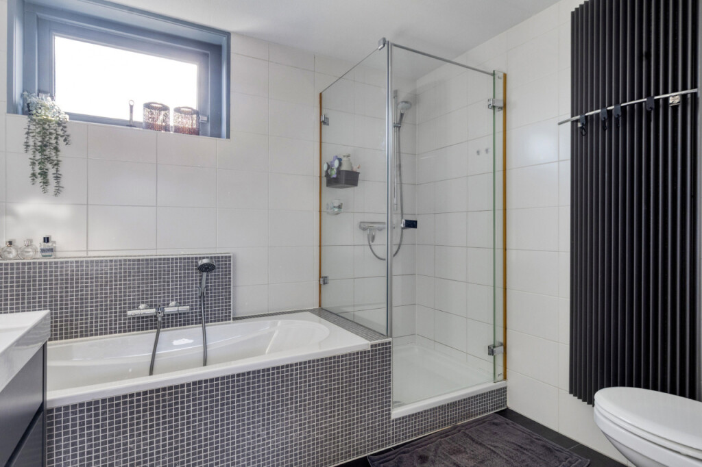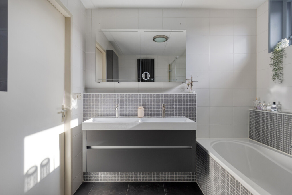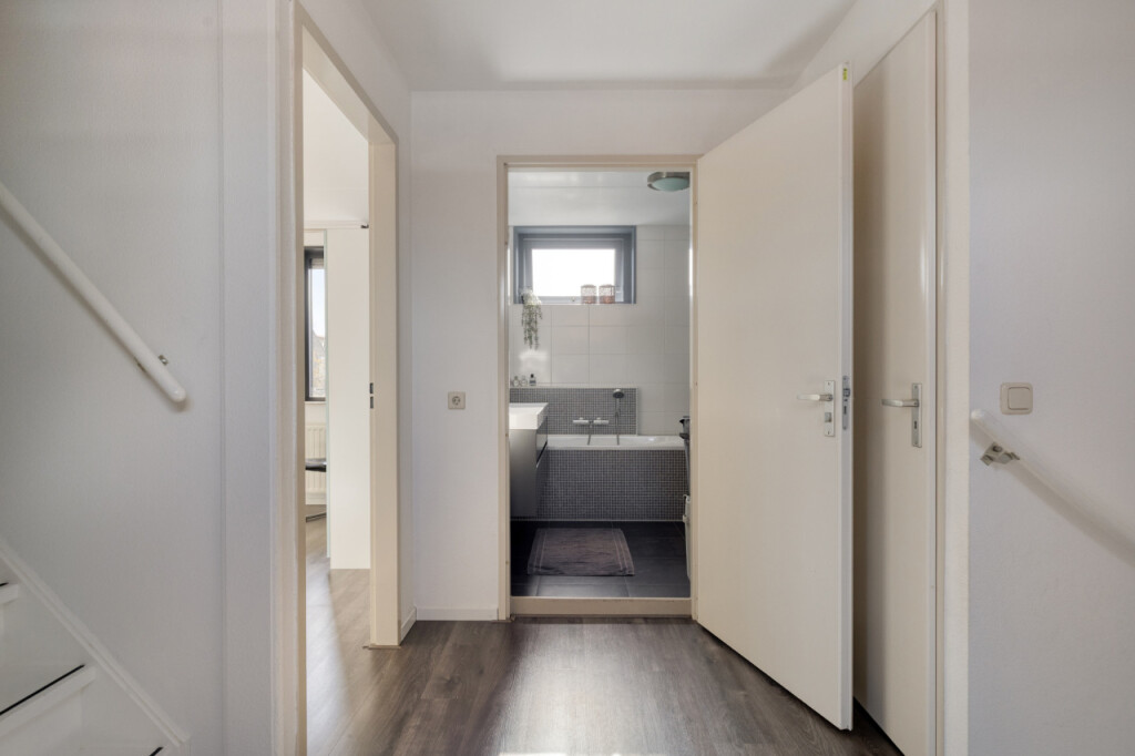 De overloop geeft toegang tot twee ruime slaapkamers en de badkamer. De kamers zijn licht en praktisch in te delen. De badkamer is compleet uitgevoerd en voorzien van een inloopdouche, dubbel wastafelmeubel en een tweede toilet.