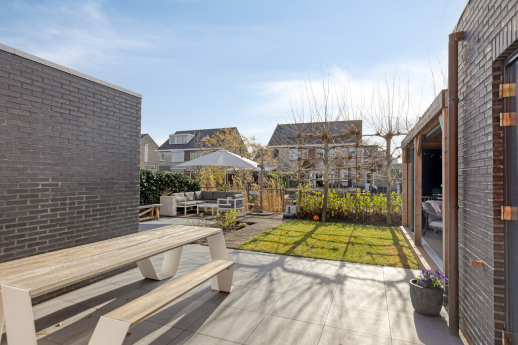 De voortuin en achtertuin zijn netjes onderhouden en dragen bij aan het verzorgde geheel van de woning.