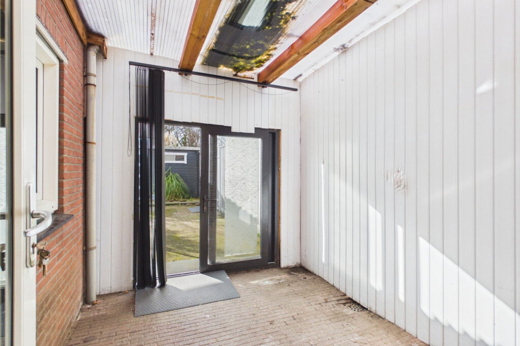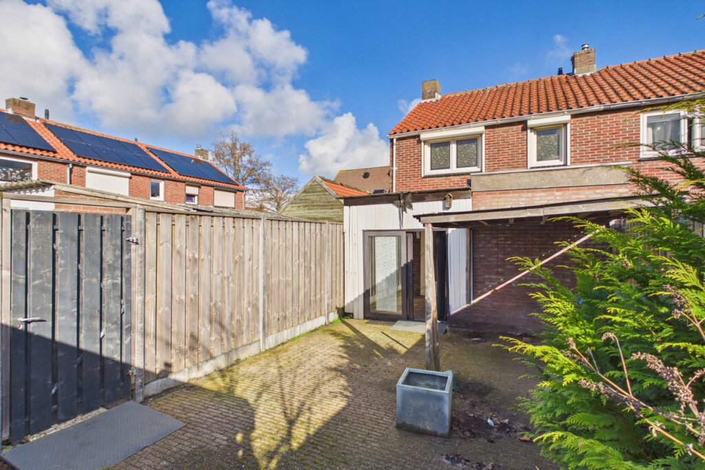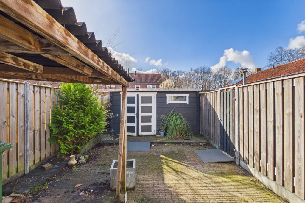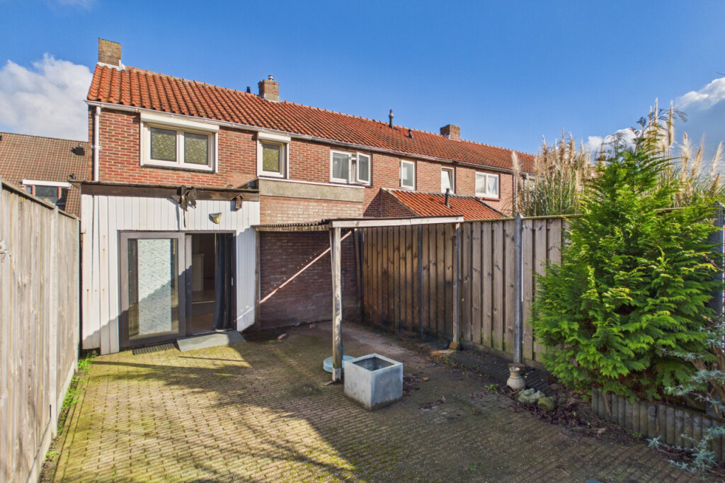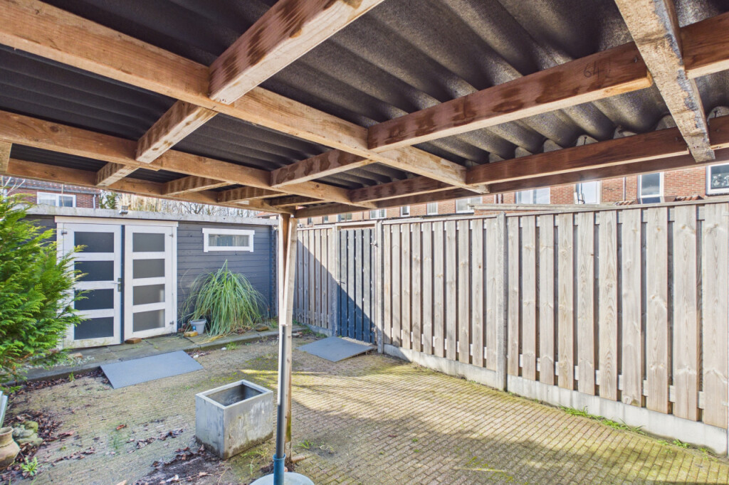 De tuin is zonnig en onderhoudsvriendelijk aangelegd en ligt op het zuidwesten, waardoor je hier optimaal kunt genieten van de middag- en avondzon. De tuin is grotendeels betegeld en voorzien van een kleine border voor wat groen. Achterin staat een vrijstaande houten berging en via de vrije achterom is de tuin ook achterom bereikbaar. Tegen de woning is bovendien een houten overkapping geplaatst, waardoor je ook bij minder weer prettig buiten kunt zitten.